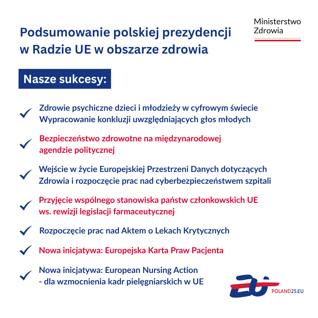 Zakończona prezydencja to nie tylko zbiór dokumentów i wydarzeń. To realne zmiany, które wpłyną na jakość opieki zdrowotnej w całej Europie. Wzmocnienie odporności systemów ochrony zdrowia, lepszy dostęp do terapii, troska o zdrowie psychiczne dzieci i młodzieży – to obszary, w które wnieśliśmy ważny wkład.