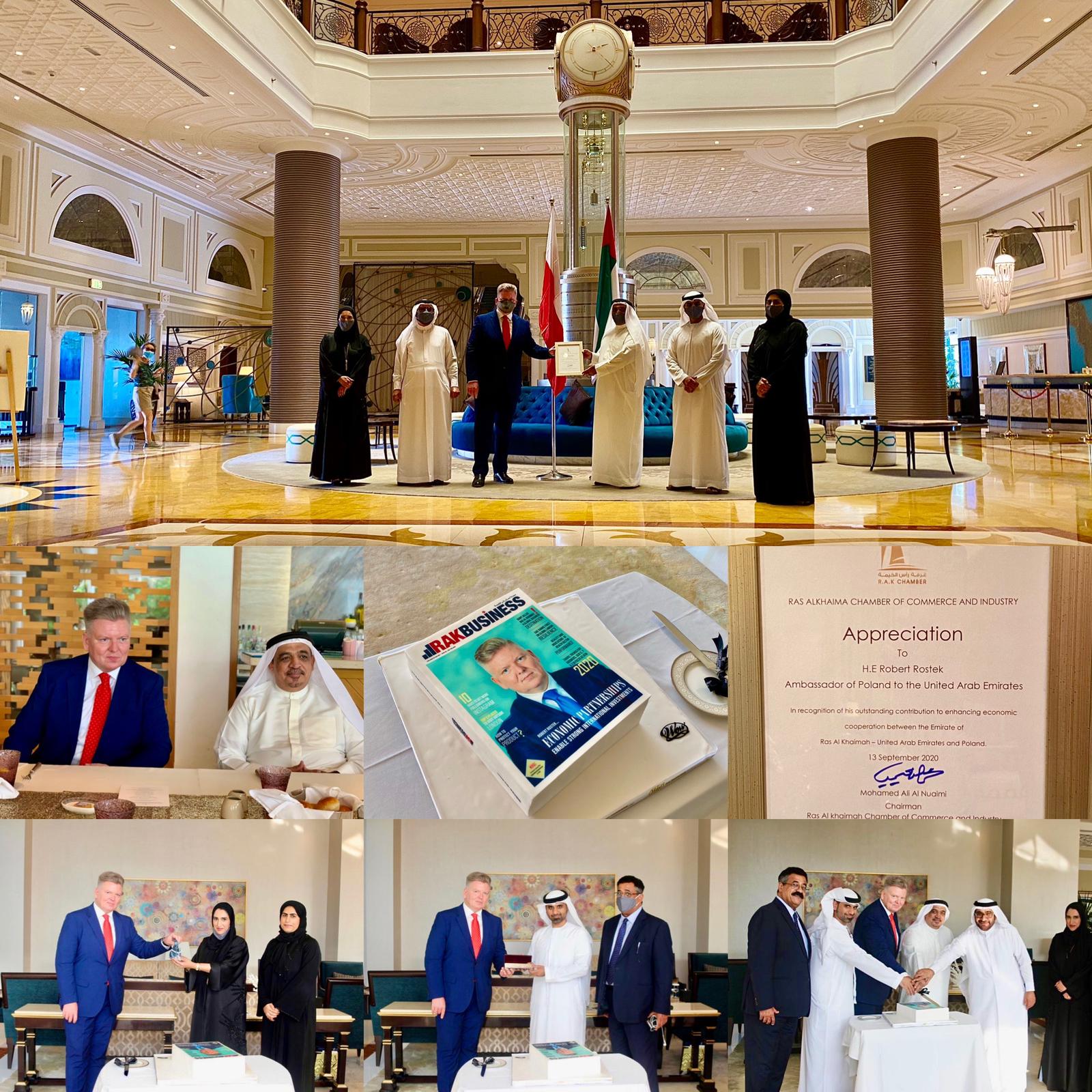 W dniach 13 - 14 września, Ambasador Robert Rostek udał się z pożegnalną wizytą do emiratu Ras al Khaimah, gdzie spotkał się m.in. z Prezesem Izby Handlowej, Mohammedem Ali Musbah Al Nuaimi w obecności urzędników Izby. Ambasador podziękował Prezesowi za jego wsparcie w rozwó relacji między Polską a Państwem Zjednoczonych Emiratów Arabskich i podkreślił silne więzi między oboma krajami, zwłaszcza w dziedzinie gospodarczej i inwestycyjnej. Prezes Izby Handlowej przekazał Ambasadorowi słowa uznania za jego wkład i nieustanne wsparcie dla współpracy bilateralnej.