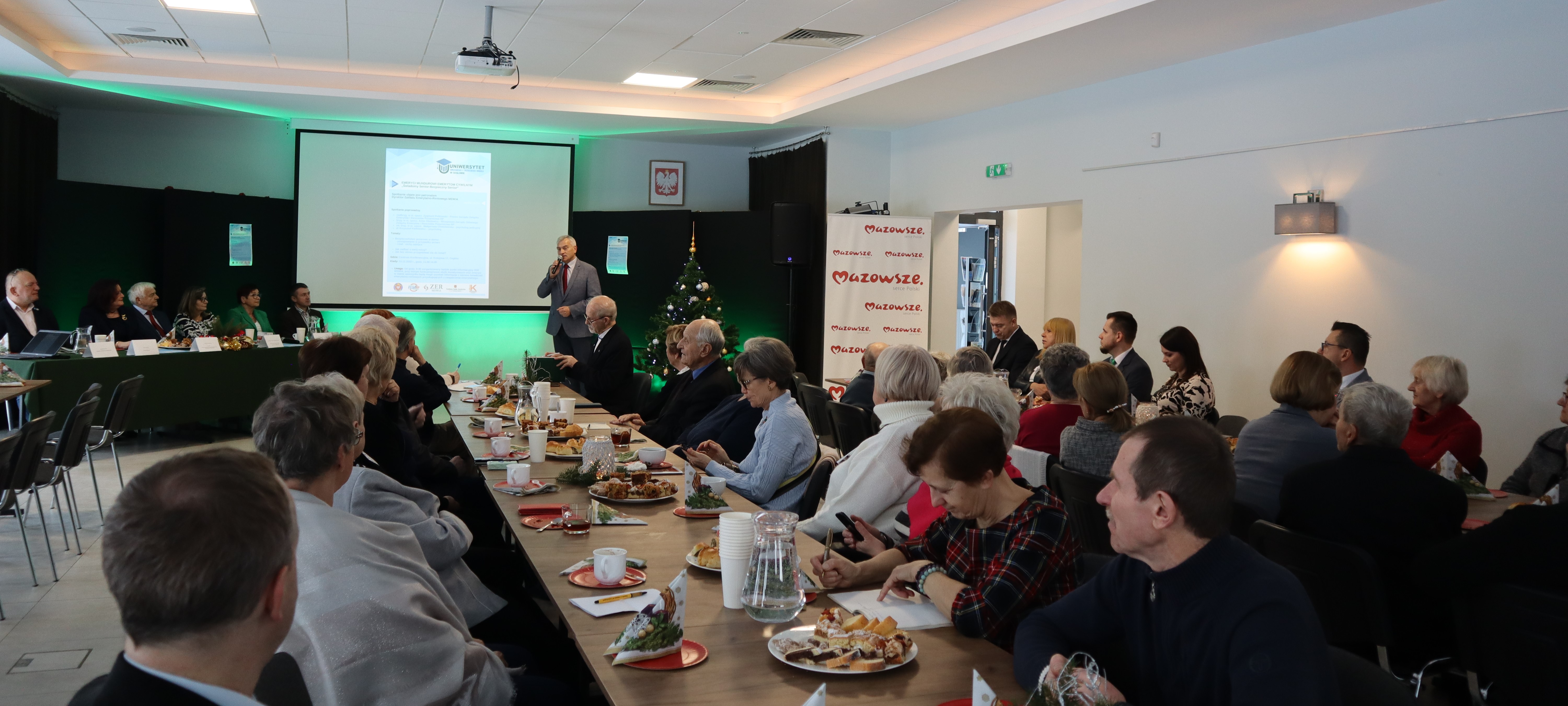 Pomimo mroźnej pogody przybyło wielu uczestników, których, jako gospodarz, powitał Pan Tadeusz Lempkowski - Przewodniczący Mazowieckiej Rady Seniorów. Ciepłe słowo do zebranych przekazała Pani Małgorzata Zdrodowska - Dyrektor Zakładu Emerytalno-Rentowego Ministerstwa Spraw Wewnętrznych i Administracji, która sprawuje patronat nad tym przedsięwzięciem, oraz ppłk SG w st. spocz. Pan Piotr Iwat - Przewodniczący Federacji Stowarzyszeń Służb Mundurowych RP, nadbryg. w st. spocz. Pan Zygmunt Politowski - Prezes Zarządu Związku Emerytów i Rencistów Pożarnictwa RP i bryg. w st. spocz. Pani dr Anna Obolewicz - Wiceprezes Zarządu Głównego ZEiRP RP. W spotkaniu uczestniczył także Burmistrz Cegłowa Pan Marcin Uchman, który w kilku słowach opowiedział o osiągnięciach Cegłowa, zachęcając do ponownego odwiedzenia.