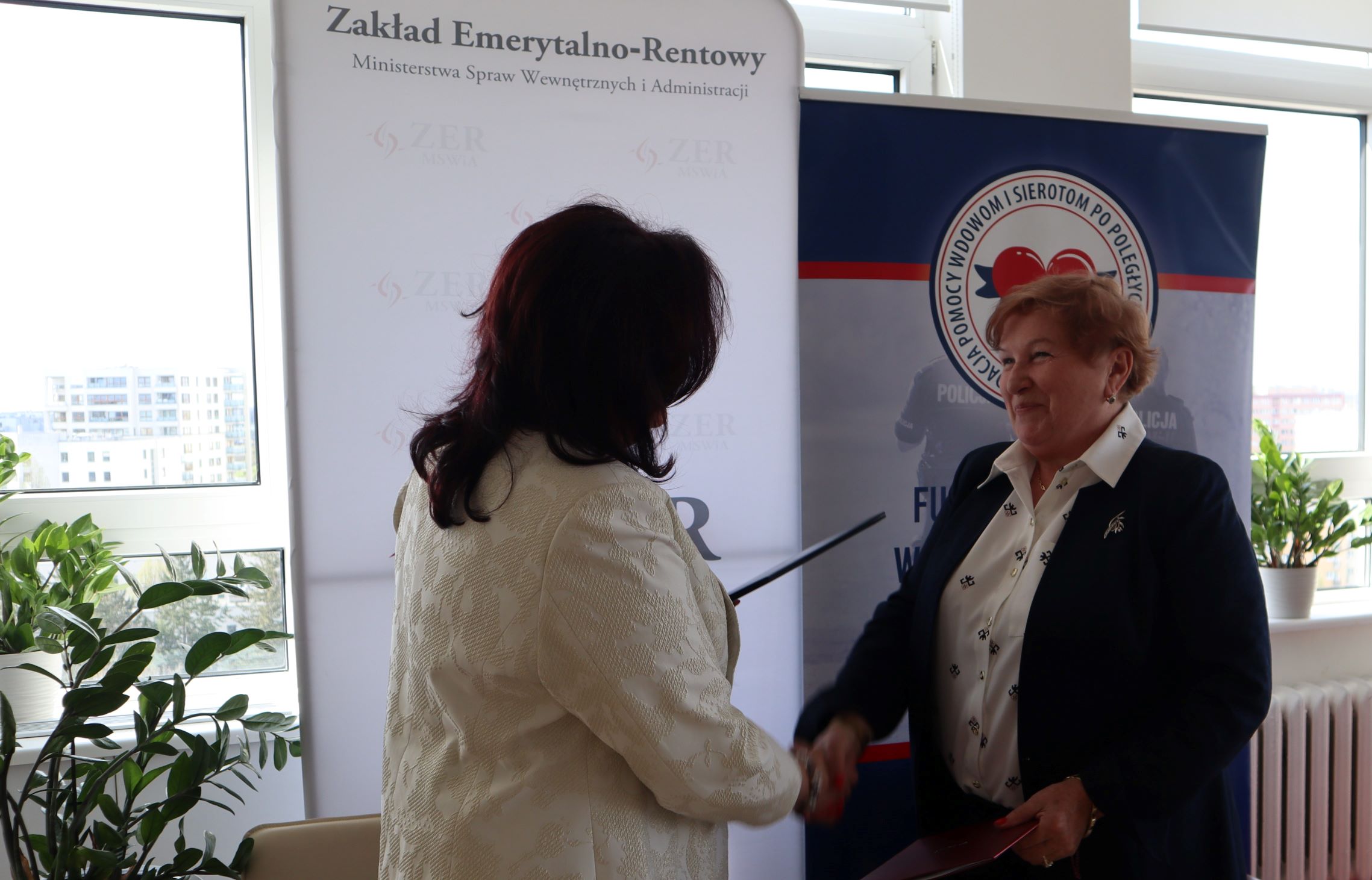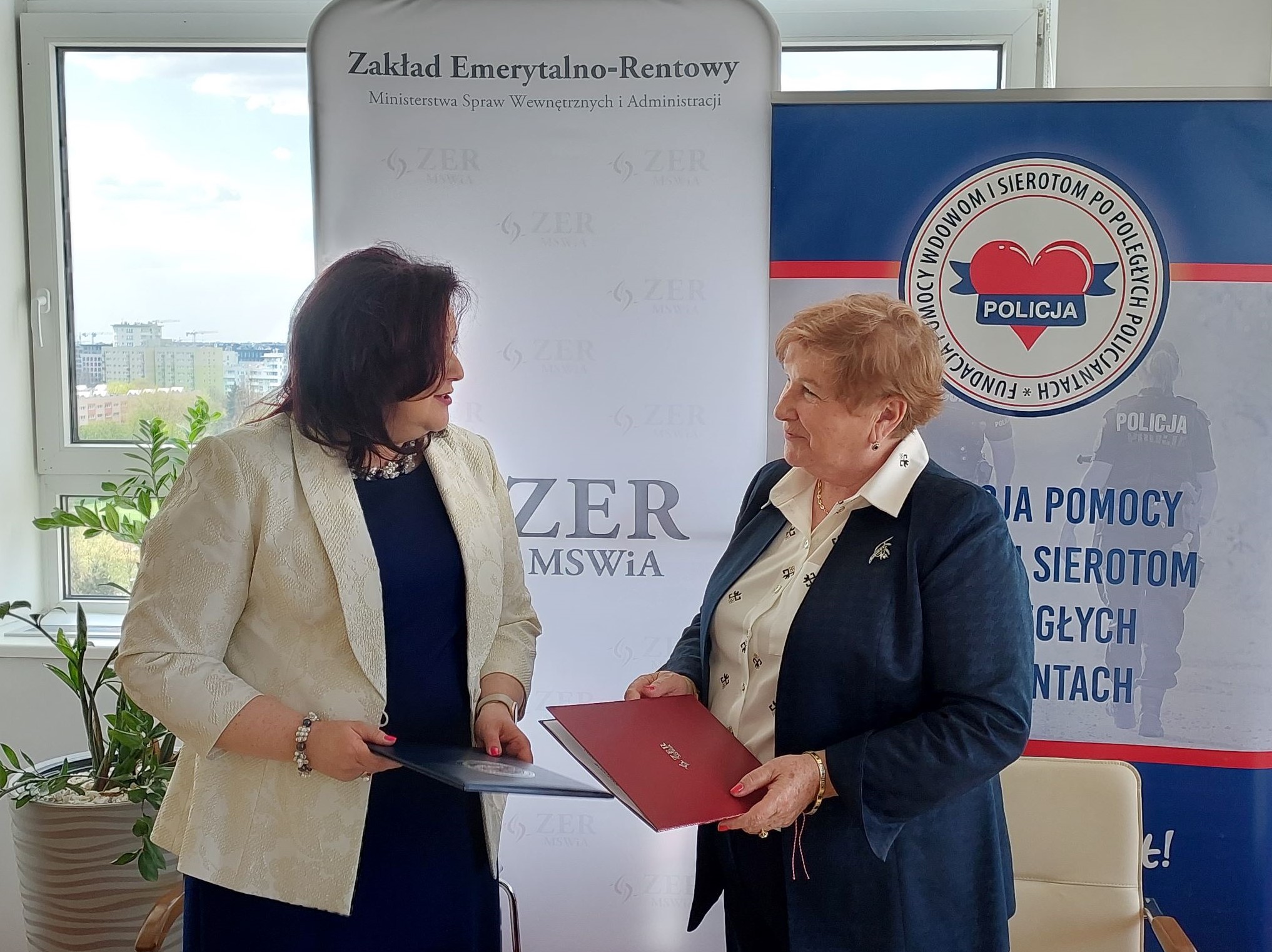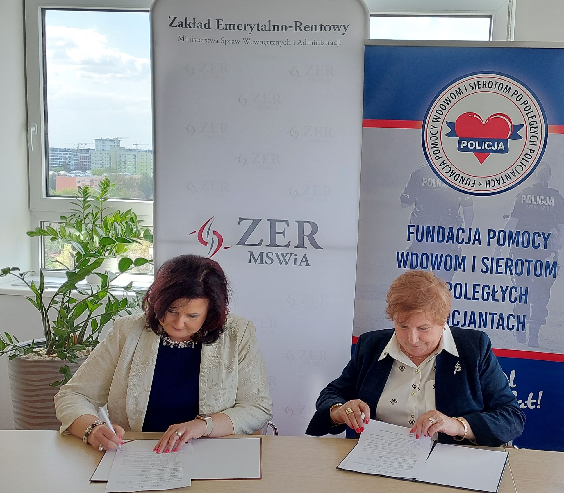 Pani Małgorzata Zdrodowska Dyrektor Zakładu Emerytalno-Rentowego Ministerstwa Spraw Wewnętrznych i Administracji oraz Pani mł. insp. w st. spocz. Irena Zając Prezes Fundacji Pomocy Wdowom i Sierotom po Poległych Policjantach podpisały 20 kwietnia 2023 r. porozumienie o współpracy.