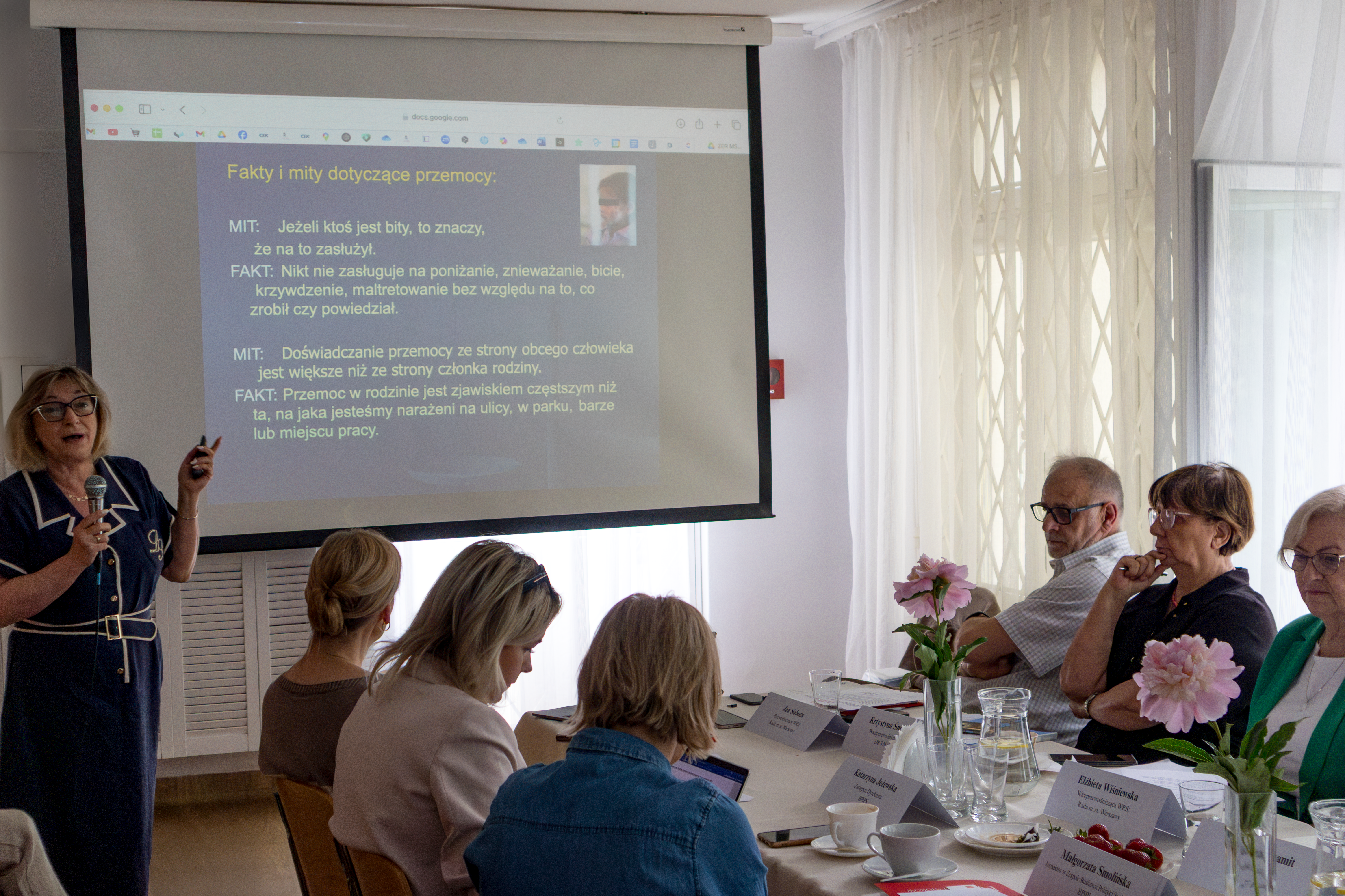Pani Mariola Gosławska rozpoczęła swoje wystąpienie od przedstawienia mitów i faktów związanych z przemocą domową. W wielu sytuacjach mylnie tłumaczoną jako prywatna sprawa, rodzinna albo występuje tylko w rodzinach z marginesu społecznego.