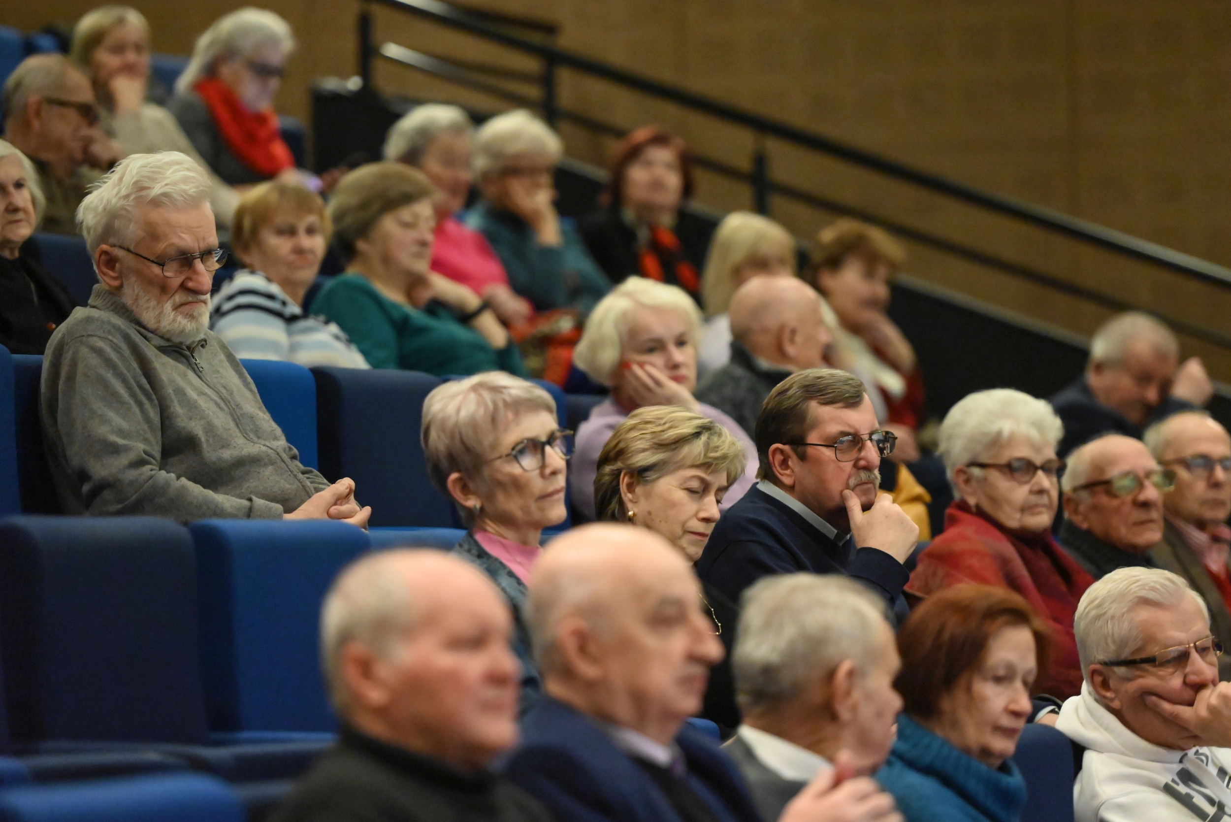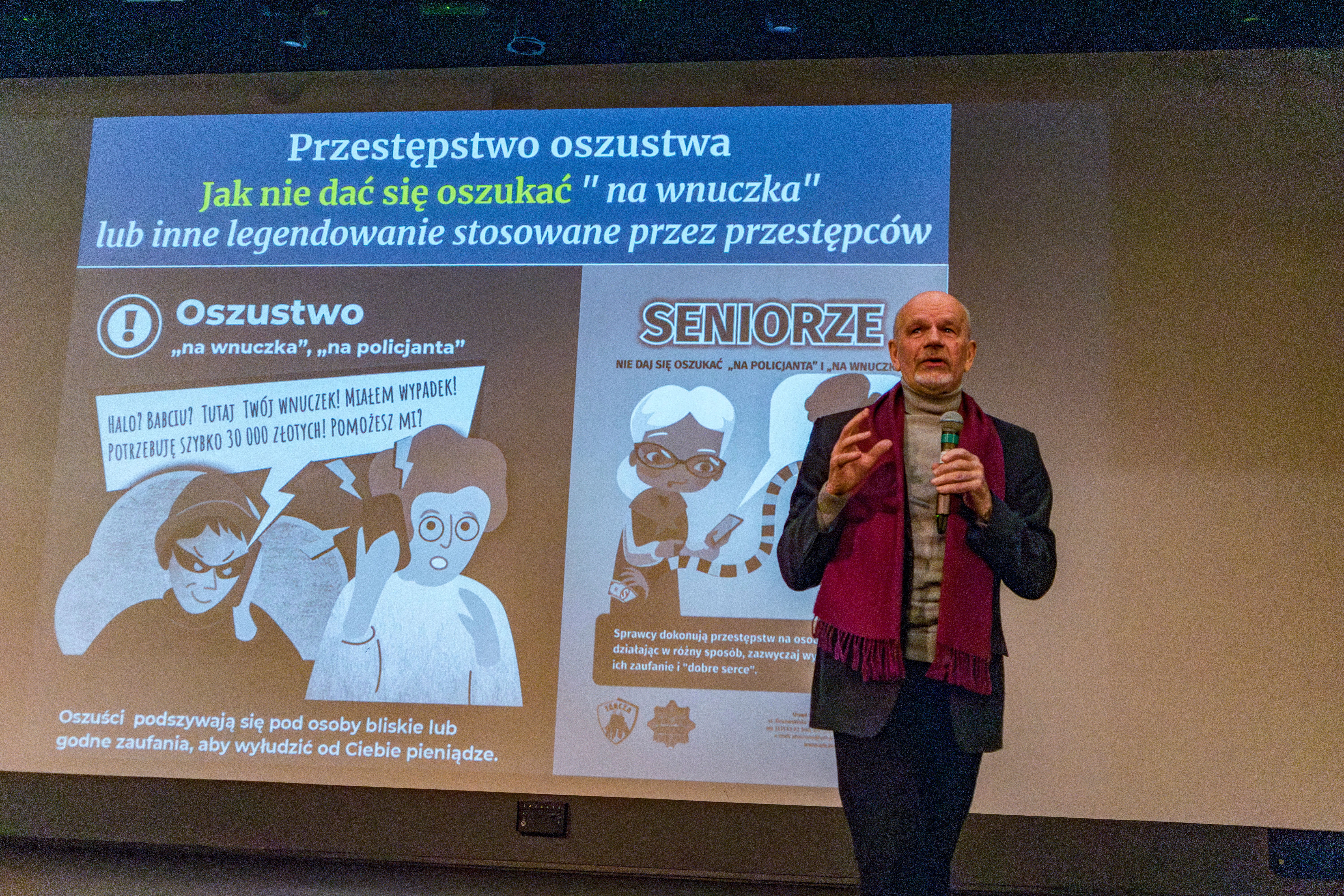 Druga część spotkania należała już do gen. insp. w st. spocz. Leszka Szredera, który podzielił się z uczestnikami swoją wiedzą i doświadczeniem w walce z przestępczością wymierzoną także w osoby starsze. Przedstawione statystyki z Komendy Głównej Policji potwierdziły, że oszustwa metodą „na wnuczka” czy „na policjanta” niestety wciąż należą do jednych z najczęściej stosowanych przez oszustów. Podając się za członka rodziny lub funkcjonariusza policji, manipulując emocjami rozmówcy i działając pod presją czasu, przestępcy skłaniają do przekazywania im pieniędzy.