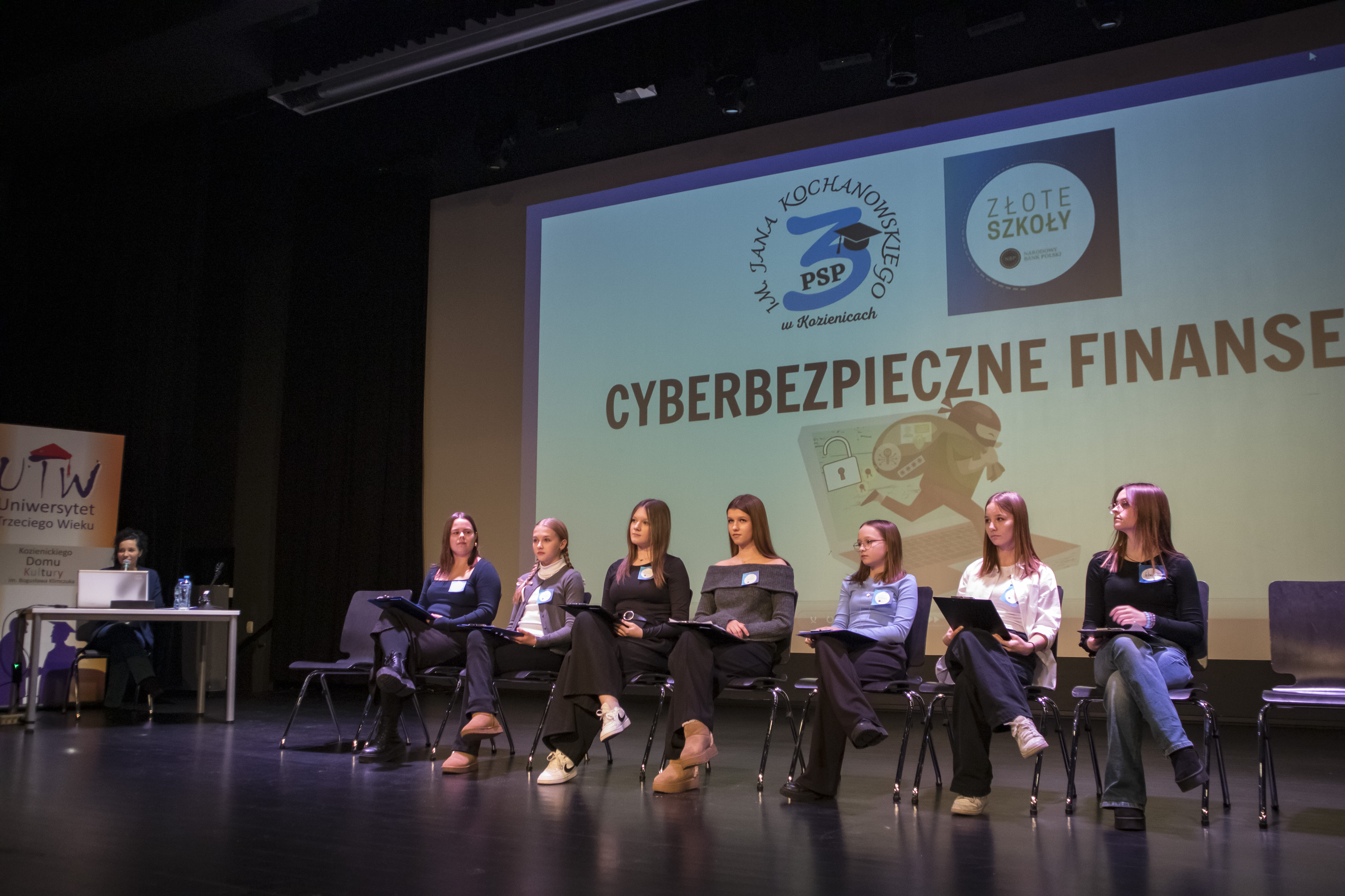 Seniorzy – studenci Uniwersytetu Trzeciego Wieku w Kozienicach, przed wystąpieniem Pana Generała, mieli niepowtarzalną okazję dowiedzieć się od kilkuosobowej grupy uczennic z Publicznej Szkoły Podstawowej nr 3 z Oddziałami Integracyjnymi im. Jana Kochanowskiego w Kozienicach, jak skutecznie chronić swoje finanse. Młodzi prelegenci doradzali, aby tworzyć silne hasła i nie stosować tych samych do wielu serwisów, nie udostępniać swoich danych osobowych w Internecie, a także nie zapisywać kodu PIN na karcie bankowej i nie podawać danych dotyczących kont bankowych osobom postronnym.