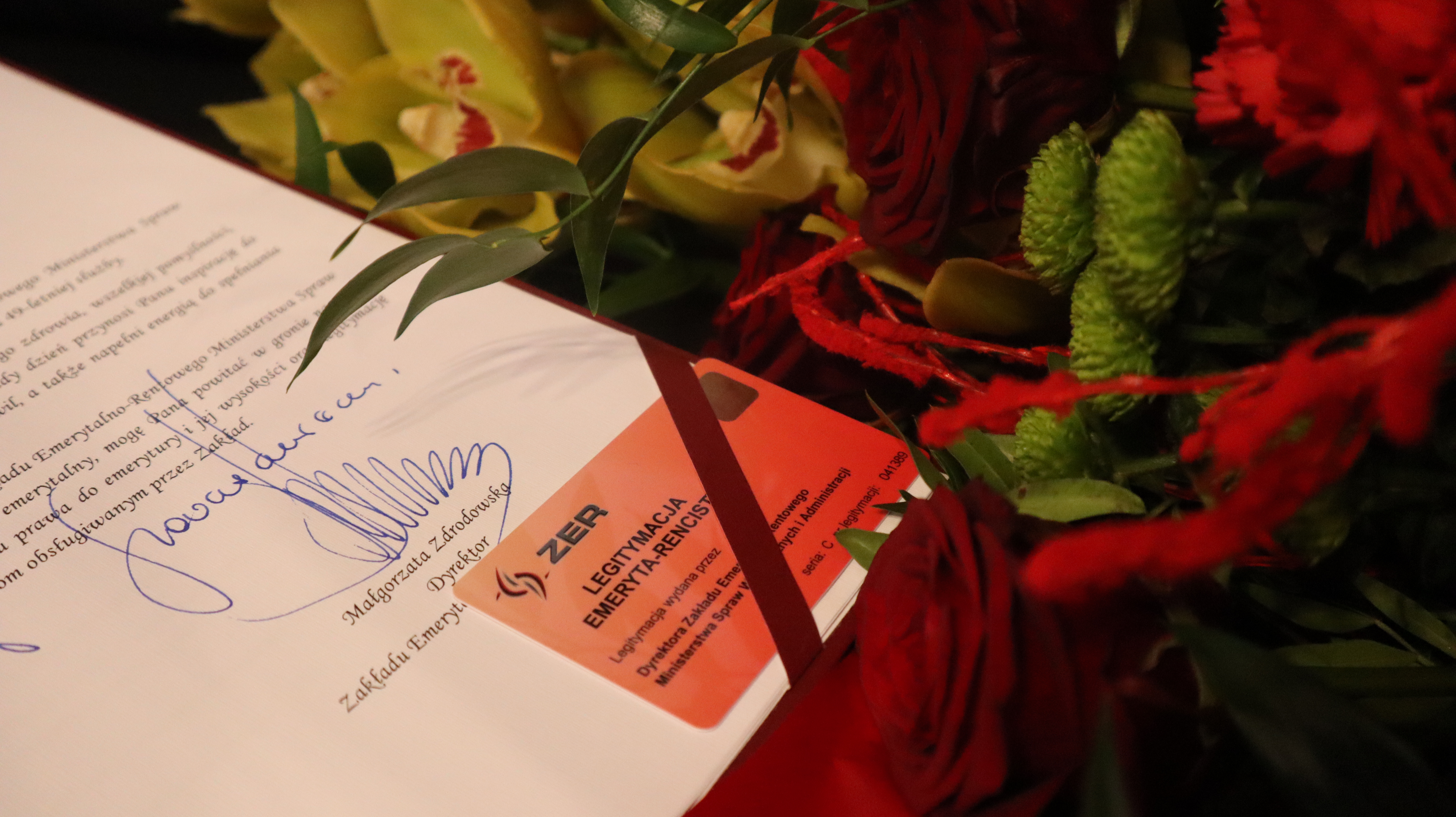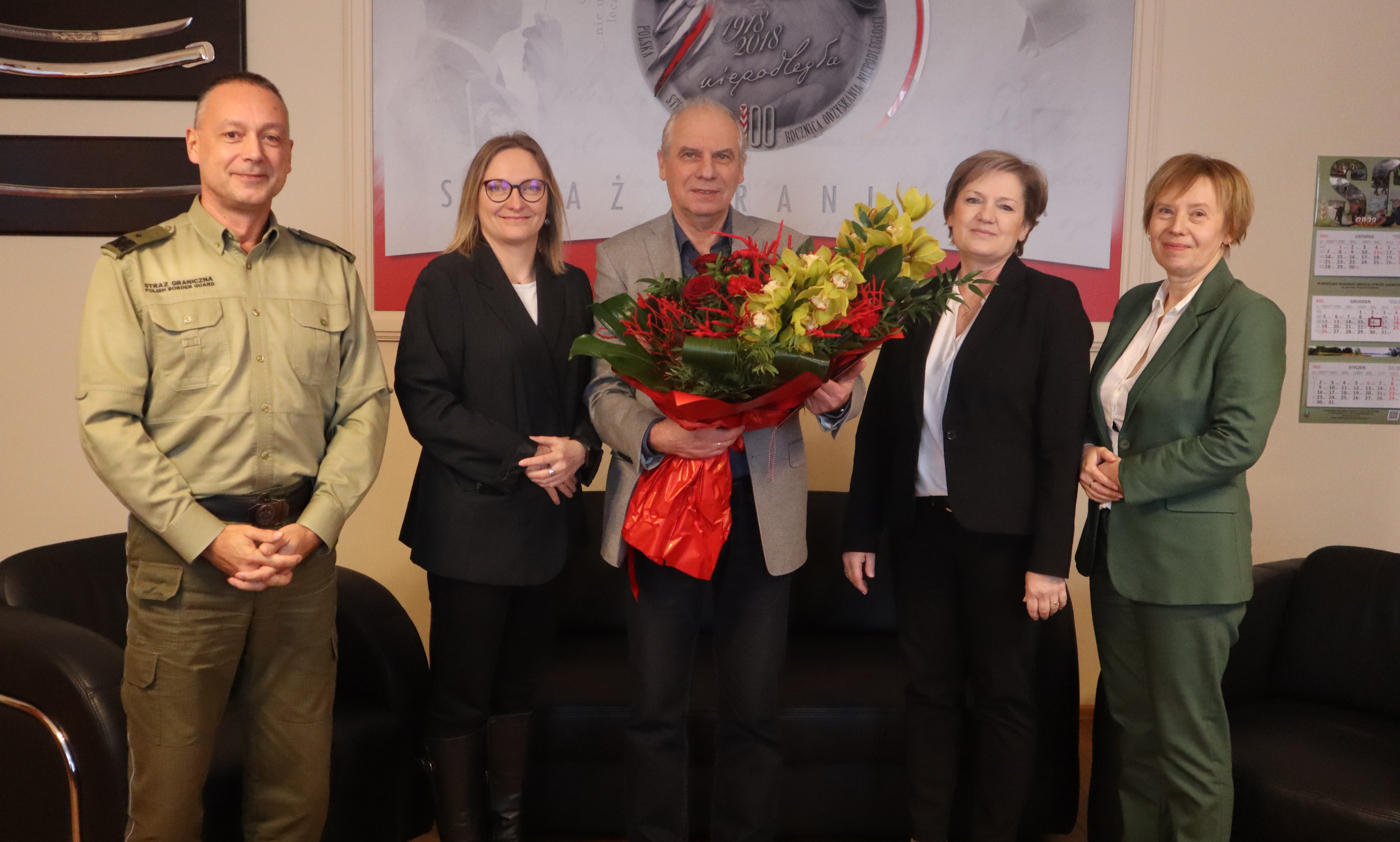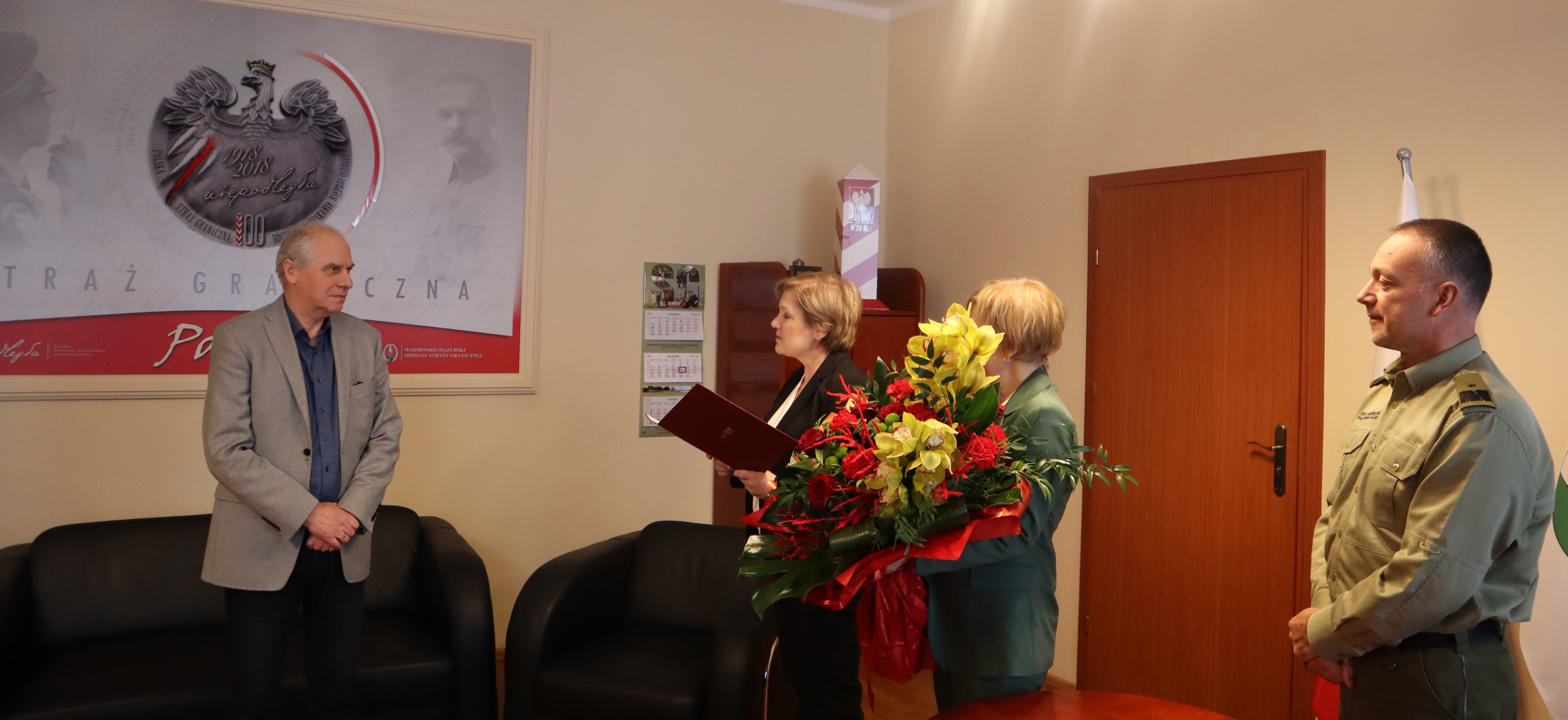 Przedstawicielki ZER MSWiA miały także sposobność osobistego spotkania z ppłk SG w st. spocz. Panem Józefem Woś, z okazji 49-letniej służby. W imieniu Pani Małgorzaty Zdrodowskiej Dyrektor Zakładu Emerytalno-Rentowego Ministerstwa Spraw Wewnętrznych i Administracji, w obecności gen. bryg. SG Roberta Inglota Komendanta Warmińsko-Mazurskiego Oddziału Straży Granicznej, Pan Józef Woś otrzymał pismo z gratulacjami za 49 lat służby, decyzję o ustaleniu prawa do emerytury i jej wysokości oraz legitymację emeryta-rencisty.
