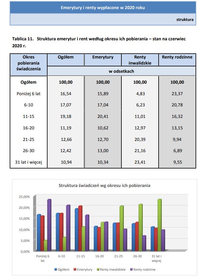 Struktura emerytur i rent według okresu ich pobierania – stan na czerwiec 2020 r.