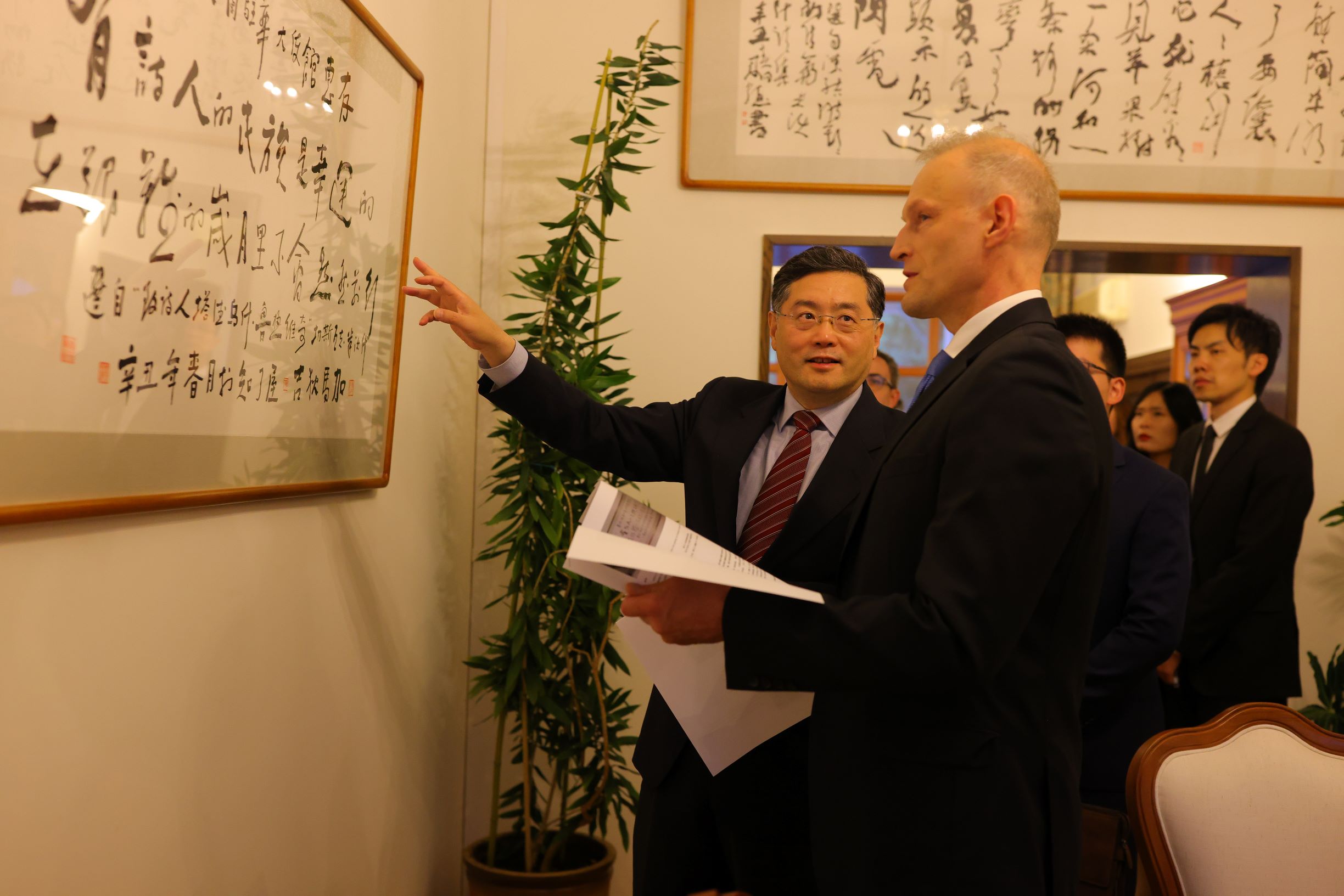 中华人民共和国外交部副部长秦刚作为荣誉嘉宾也发表了致辞。他表示,希望不论是在中国-中东欧合作框架下(即“17+1”),还是在中国-欧盟关系层面,中波合作都能继续向前发展。借此庆祝活动,秦副部长欣赏了大使府邸展示的以维斯瓦娃·辛波斯卡和切斯瓦夫·米沃什这两位作家的诗歌选段为题材的中国书法作品。该作品出自吉狄马加之手,他是中国当代最为重要的诗人之一,曾获得过波兰雅尼茨基文学奖。