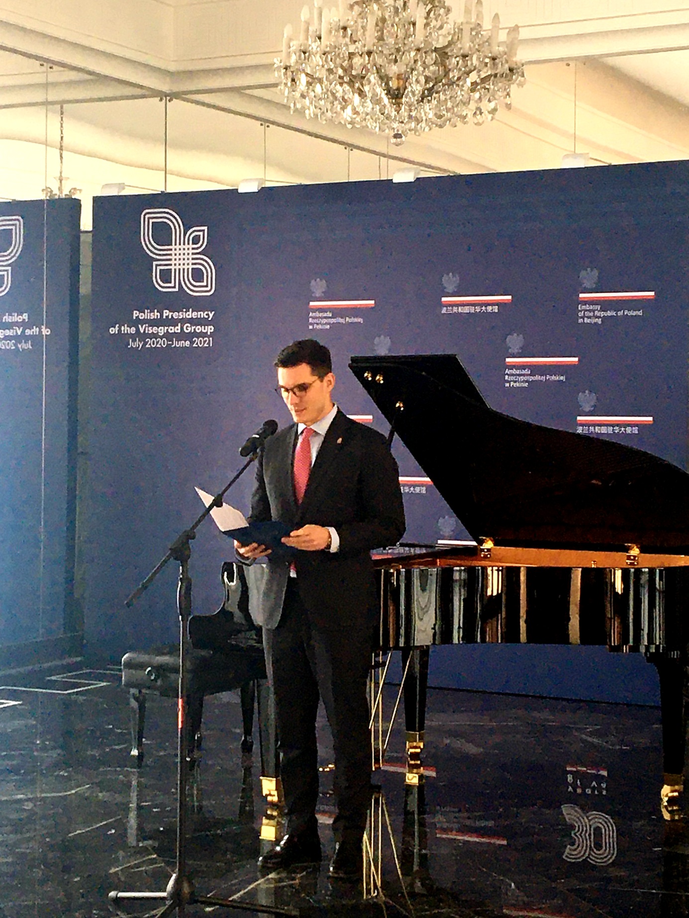 2021年3月11日和16日波兰驻华大使馆庆祝了正值波兰担任轮值主席国之际的维谢格拉德集团(V4)成立30周年。伴随着钢琴音乐会的举办,还举行了周年纪念展和招待会,外交使团和中方机构的代表参加了本次活动。