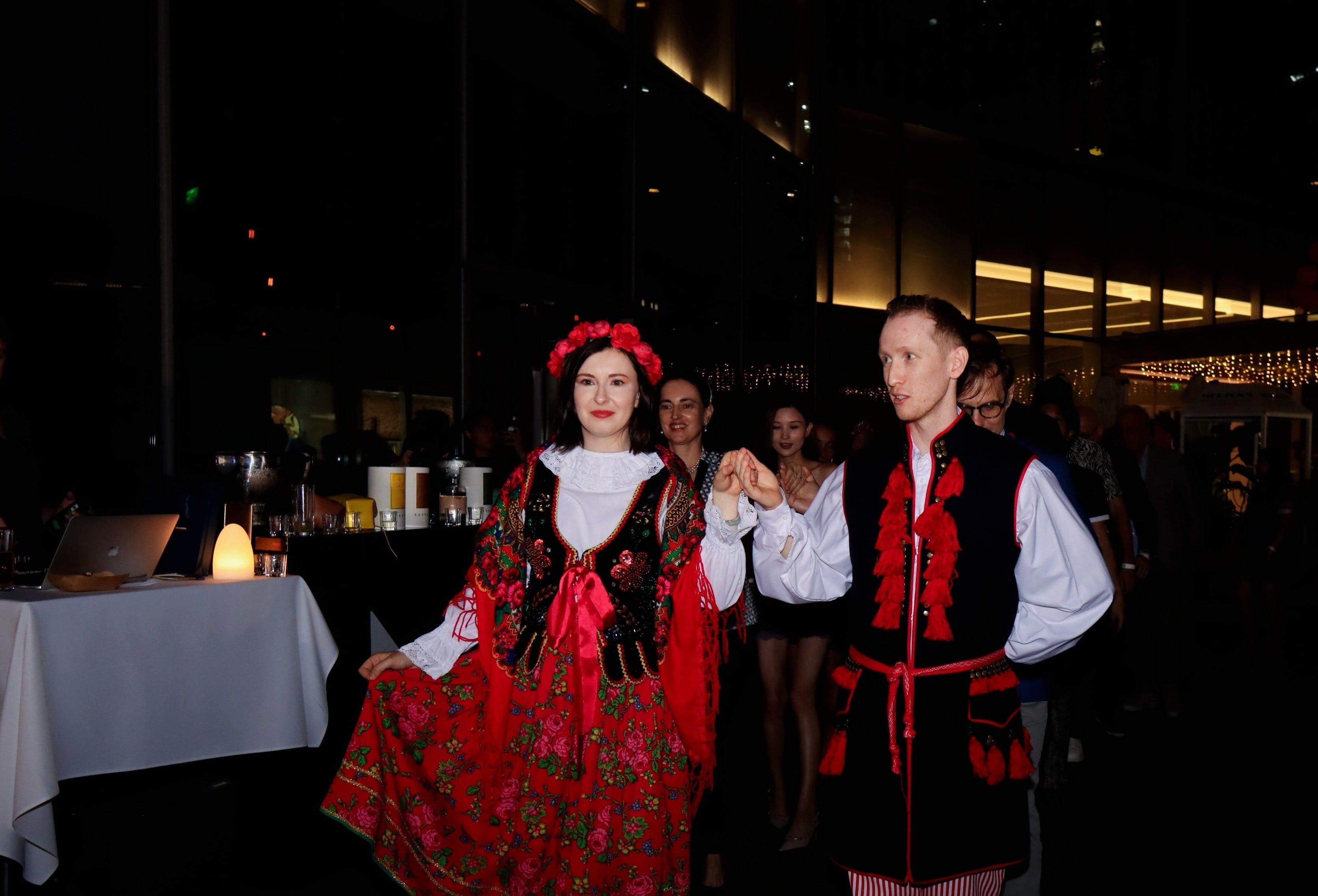 活动以波兰共和国驻广州总领事彼得·诺沃特尼亚克(Piotr Nowotniak)的致辞拉开序幕,他邀请来宾积极参与丰富的互动环节。宾客们可以在拍照区留影,背景图案包含波兰传统民俗图案、美食及猞猁、野牛、河狸等动物元素。拍照区还准备了动物玩偶及民族服饰道具。随后,来宾们参加了有关波兰自然与文化知识的问答游戏,前三名获胜者获得了在中国可购买的波兰特色产品。之后,总领事馆工作人员身着波兰民族服饰带领嘉宾共舞波兰传统舞蹈——波罗涅兹舞。虽然舞步复杂、许多外国嘉宾缺乏经验,但气氛热烈愉快,大家纷纷与穿着民族服装的舞者合影留念。整个晚上,来宾们一边欣赏波兰音乐,一边享用精心准备的波兰美食。现场还举行了抽奖活动,奖品由总领事馆及波兰企业提供。活动最后,每位来宾都收到了来自波兰共和国驻广州总领事馆精心设计的“波兰生命之林”系列礼品套装。