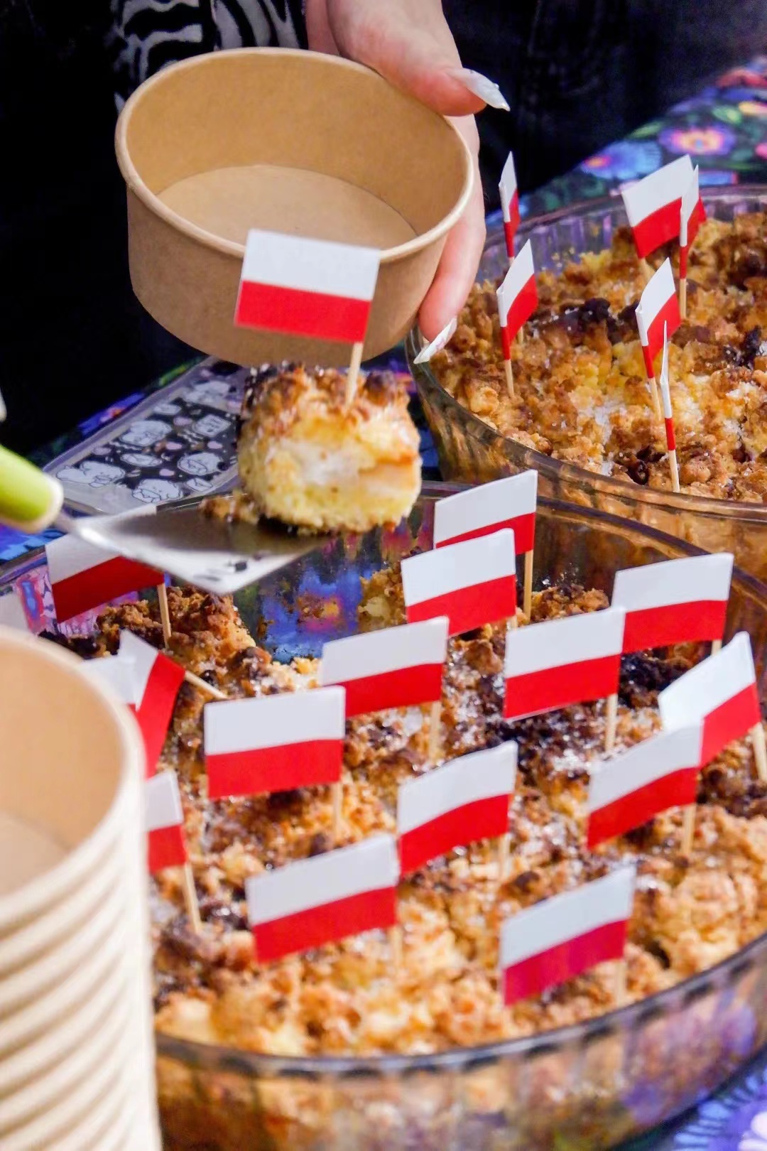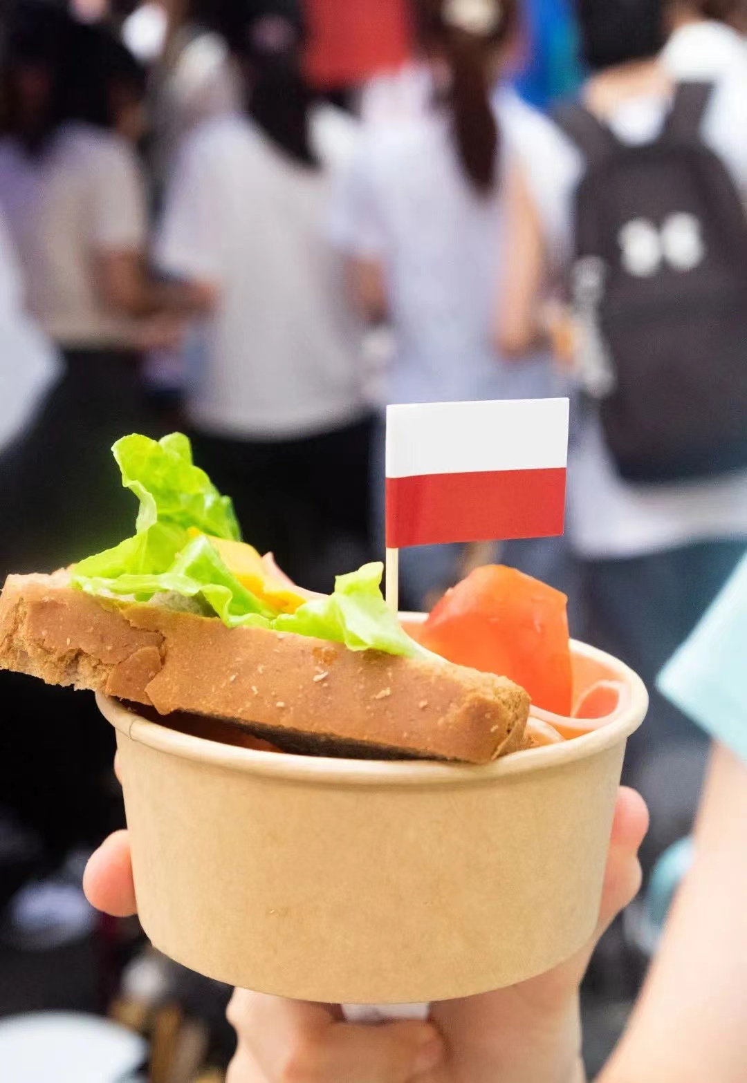 波兰展位由波兰语专业大一和大二年级的学生组织,他们在茅银辉教授和其他波兰语老师的帮助下准备了传统的波兰菜肴:波兰饺子、蔬菜沙拉和波兰苹果派。波兰共和国驻广州总领事馆还提供了弗雷德里克·肖邦形象的装饰品和小物件,以及波兰的旅游手册。本次美食嘉年华是面向中国青年宣传波兰的绝佳机会,让大家了解了波兰的历史与有趣的文化。