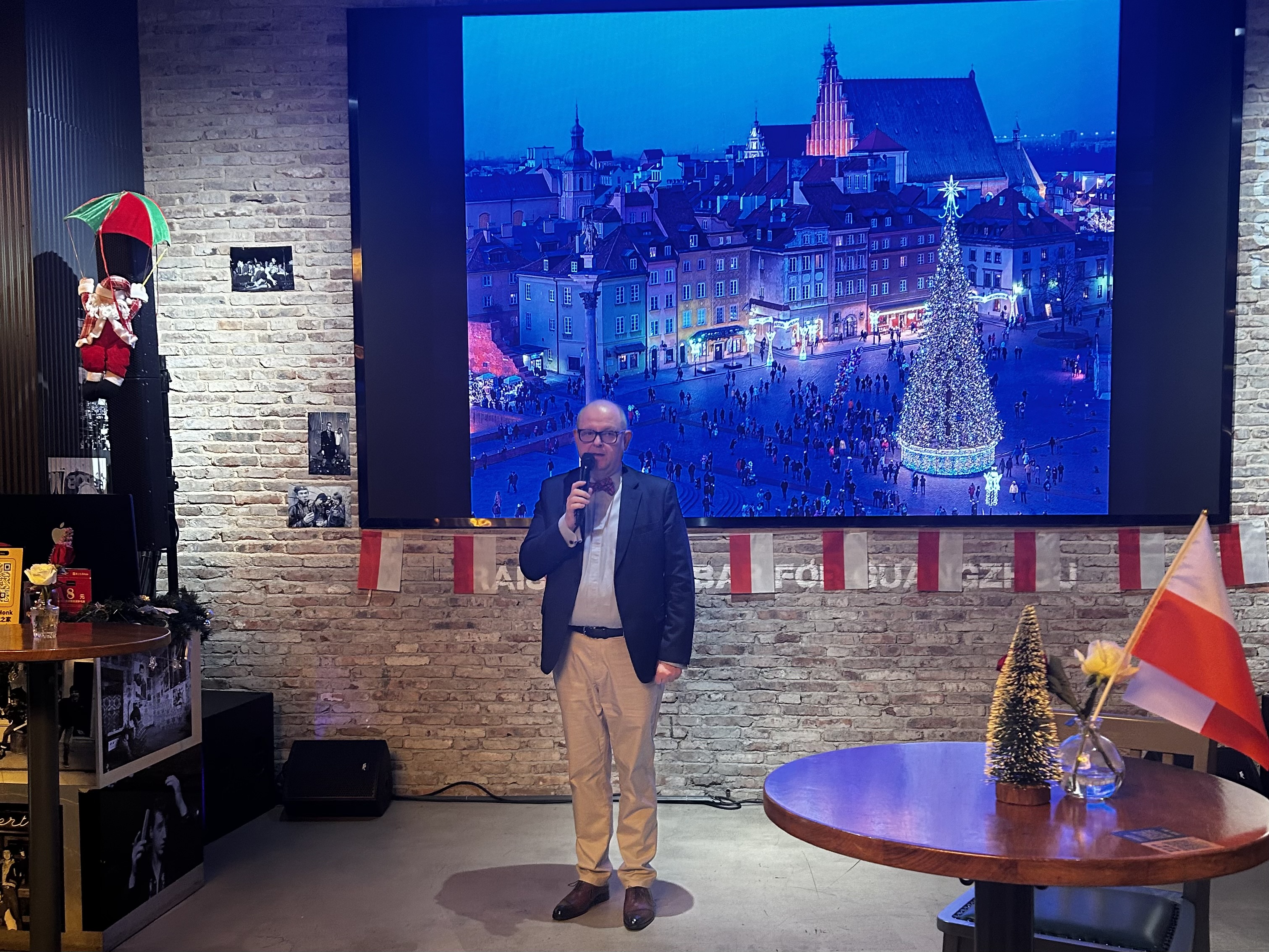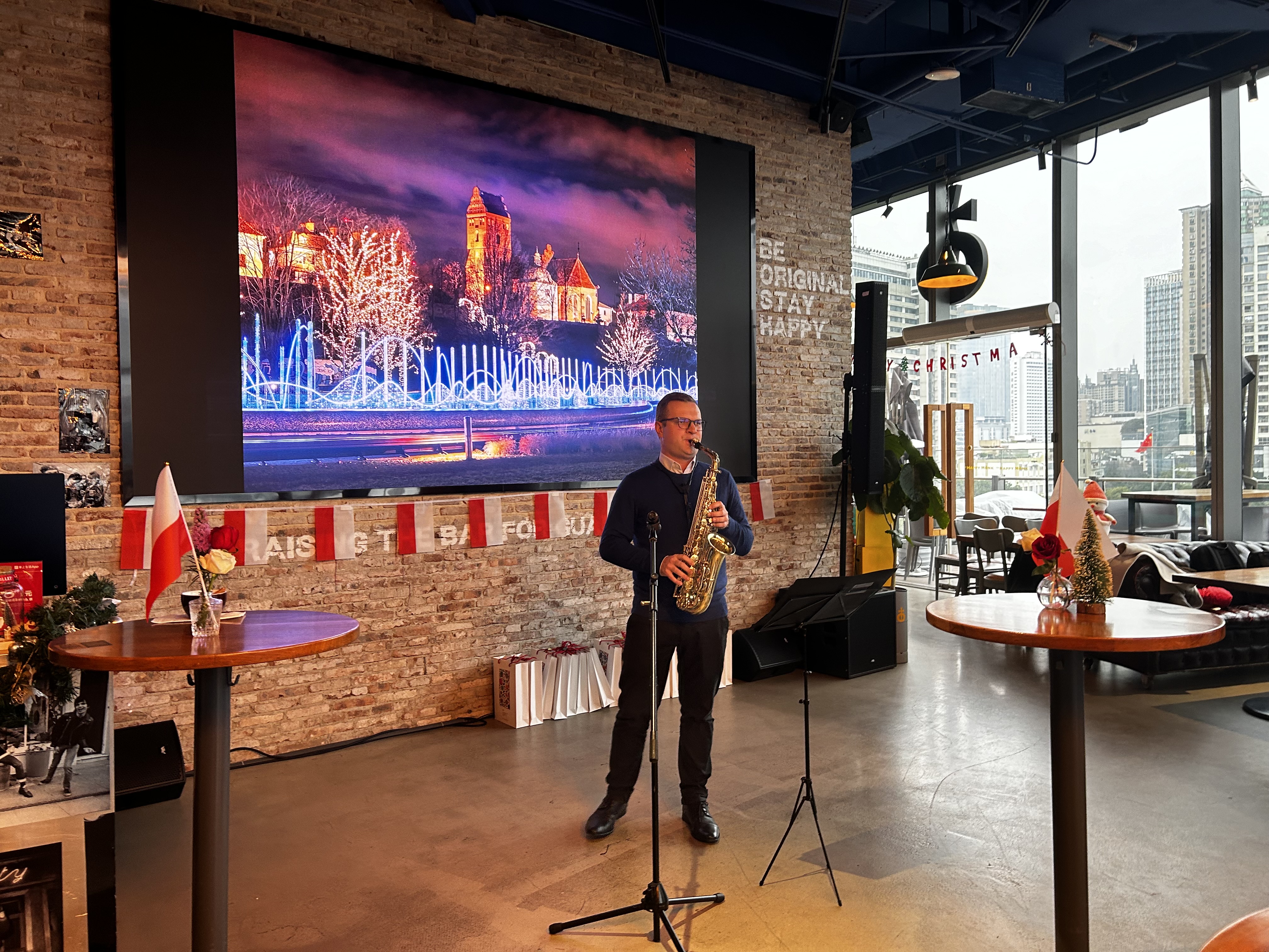 波兰共和国驻广州总领事 Piotr Nowotniak 先生致辞后,旅居香港的波兰音乐家兼萨克斯管演奏家 Karol Kijas 先生现场奉上了一场圣诞颂歌音乐会。 聚会上,不仅有来自圣诞老人的礼物和人造雪,还有波兰特色圣诞菜肴,如波兰饺子、蘑菇汤、姜饼和热红酒,让生活在中国的波兰人感觉就像在家里一样。