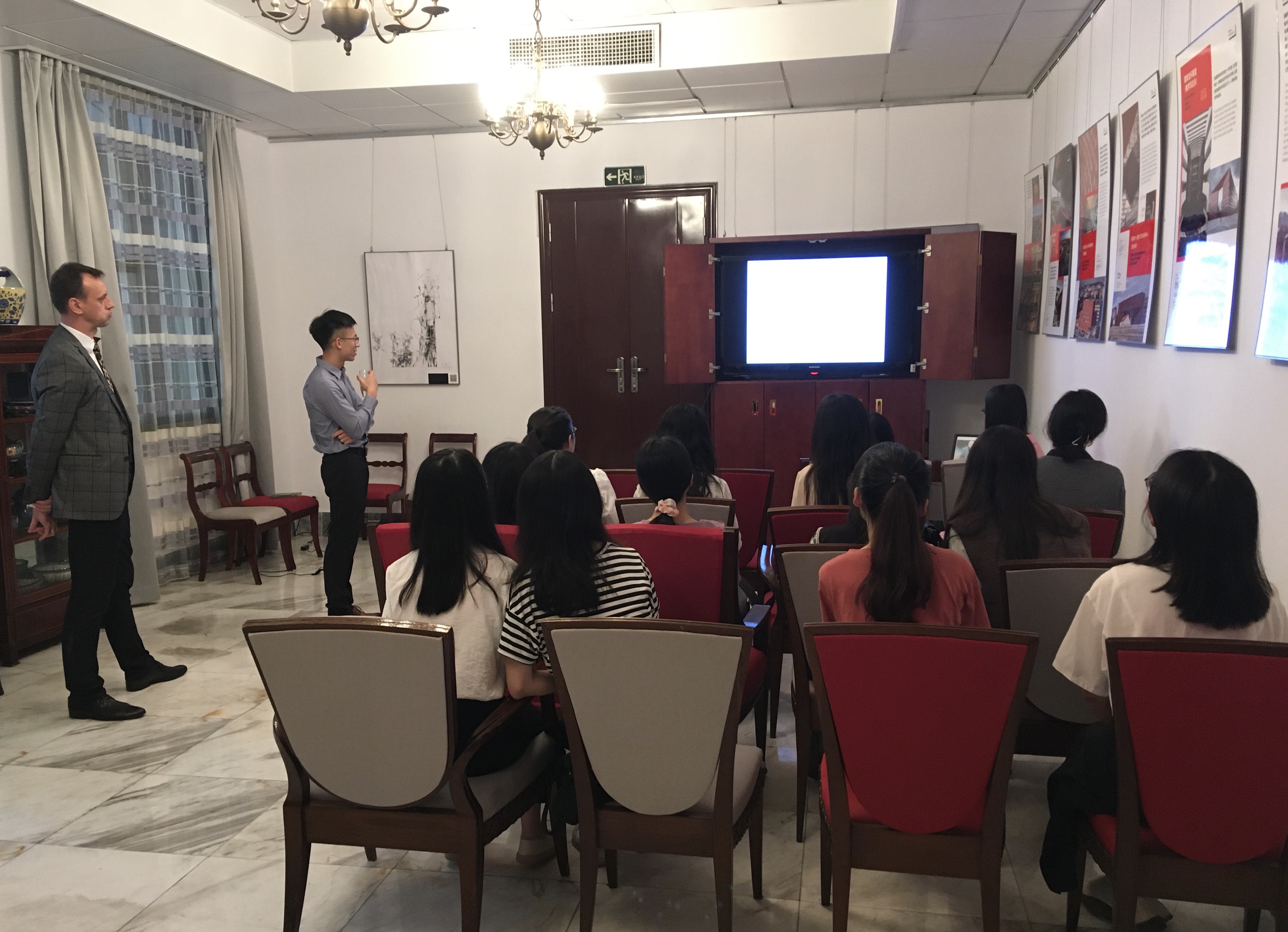 领事馆的接待室变成了一个电影院,学生们和讲师在这里观看了波兰著名电影及戏剧导演安杰伊·瓦依达(Andrzej Wajda)执导的电影《甜蜜的冲动》。放映结束后,我们讨论了影片中涉及的死亡、爱情和转瞬即逝的话题,这些话题激发来宾们提出了各种非常有趣的观点。