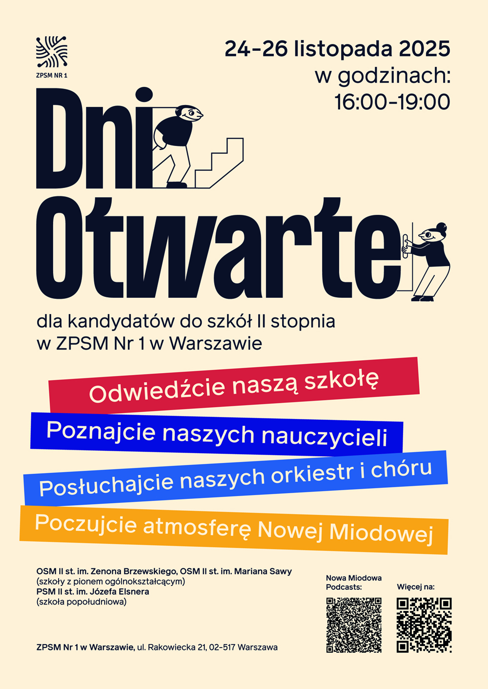 W dniach 24-26 listopada 2025 roku, w godzinach 16 – 19 zapraszamy na dni otwarte w ZPSM Nr 1 w Warszawie.