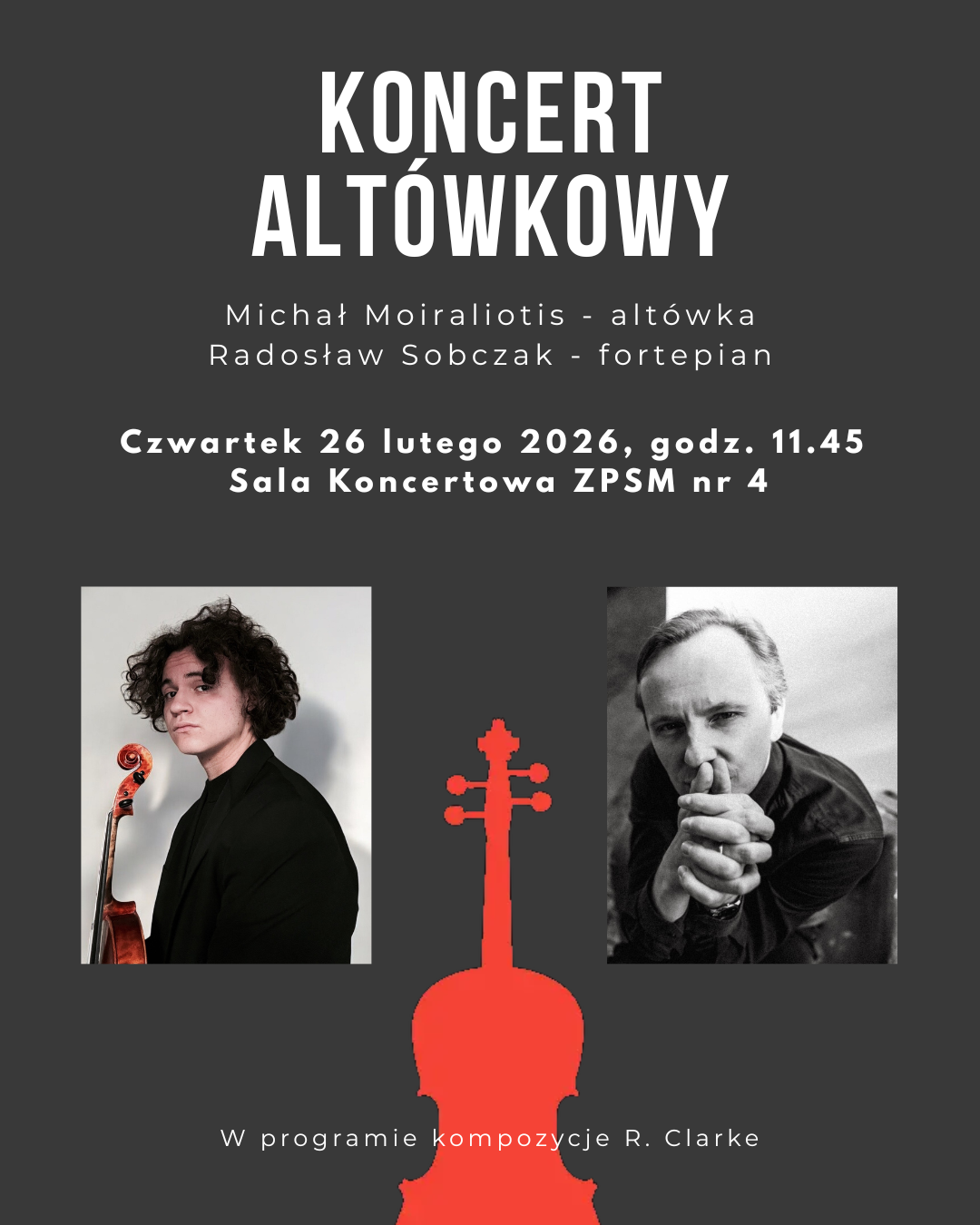 Serdecznie zapraszamy na koncert w wykonaniu Michała Moiraliotisa (altówka) i Radosława Sobczaka (fortepian).