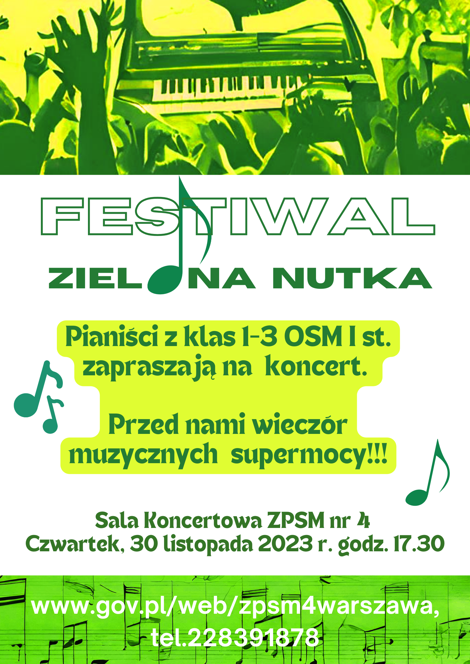 Zapraszamy na Festiwal "Zielona Nutka" w czwartek, 30 listopada 2023 r. 0 godz. 17.30. Wystąpią najmłodsi pianiści ZPSM nr 4 z klas 1-3 OSM I st. i z całą pewnością zaprezentują swoje "muzyczne supermoce"! Będzie dużo muzycznej zabawy, oklasków i wyróżnień, kolorowe dyplomy i inne niespodzianki. Zapraszają organizatorki Festiwalu, Panie Anna Łuczak i Katarzyna Mościcka-Przeniosło