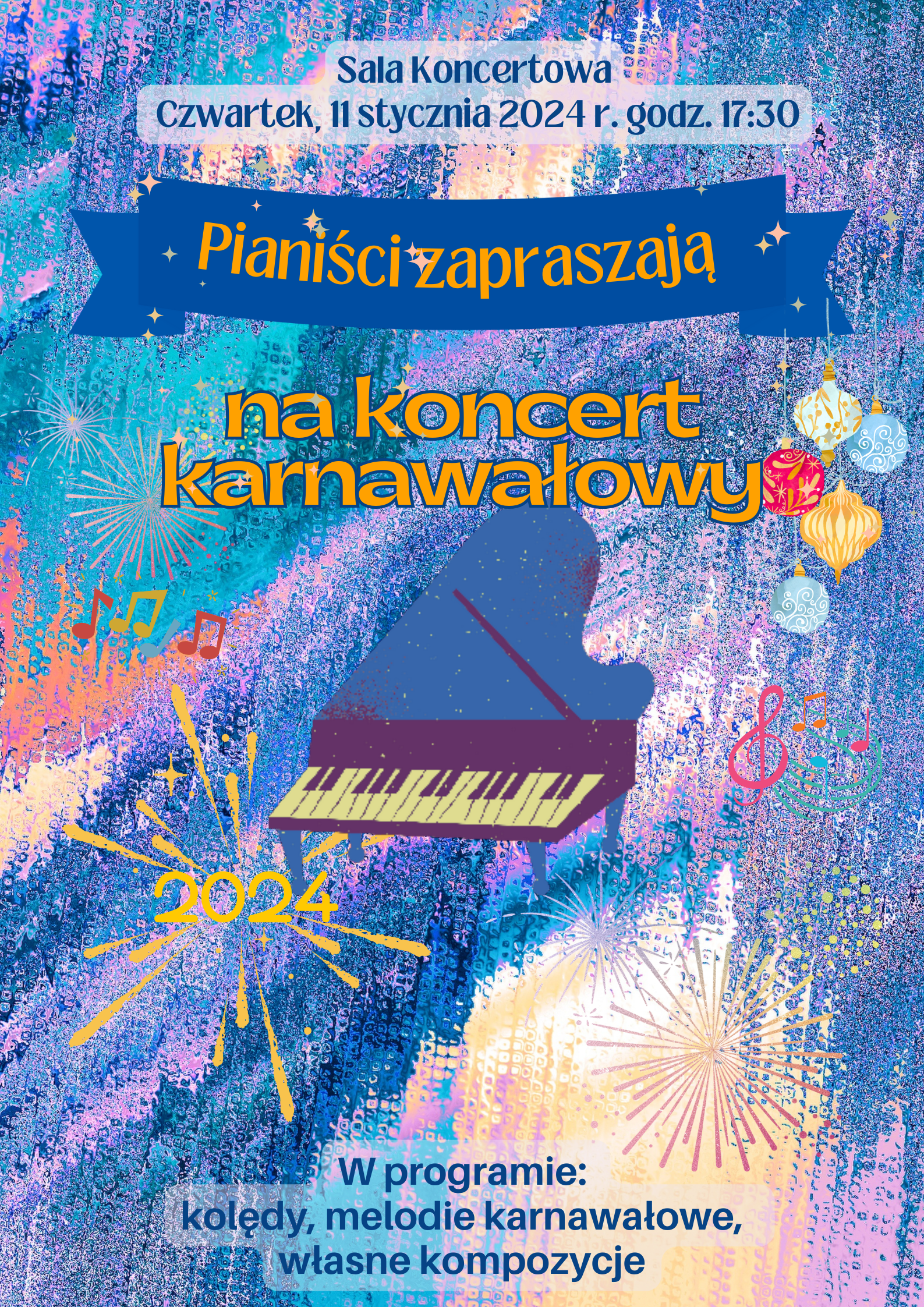 W czwartek, 11 stycznia 2024 r. o godz. 17:30 pianiści zapraszają na swój doroczny Koncert Karnawałowy. Będą kolędy, melodie karnawałowe i kompozycje własne uczniów. A świetną zabawę gwarantują organizatorki, niezastąpione Panie Anna Łuczak i Katarzyna Mościcka-Przeniosło! Czekamy na Państwa, przybywajcie całymi rodzinami!