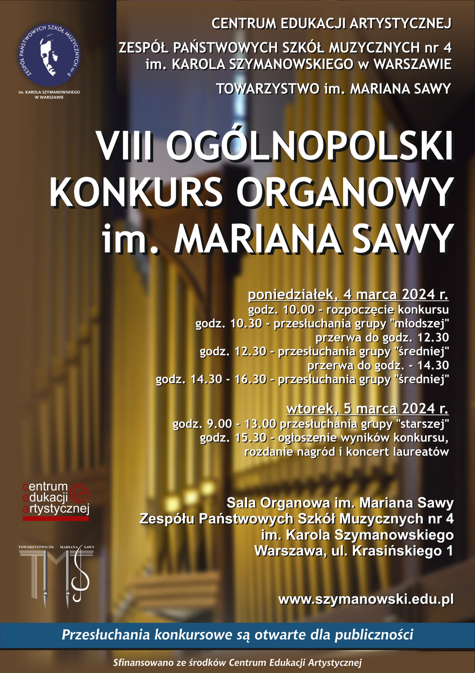 Centrum Edukacji Artystycznej, ZPSM nr 4 im. K. Szymanowskiego w Warszawie i Towarzystwo im. Mariana Sawy ogłaszają VIII Ogólnopolski Konkurs Organowy im. Mariana Sawy, który odbędzie się w dniach 4-5 marca 2024 r.