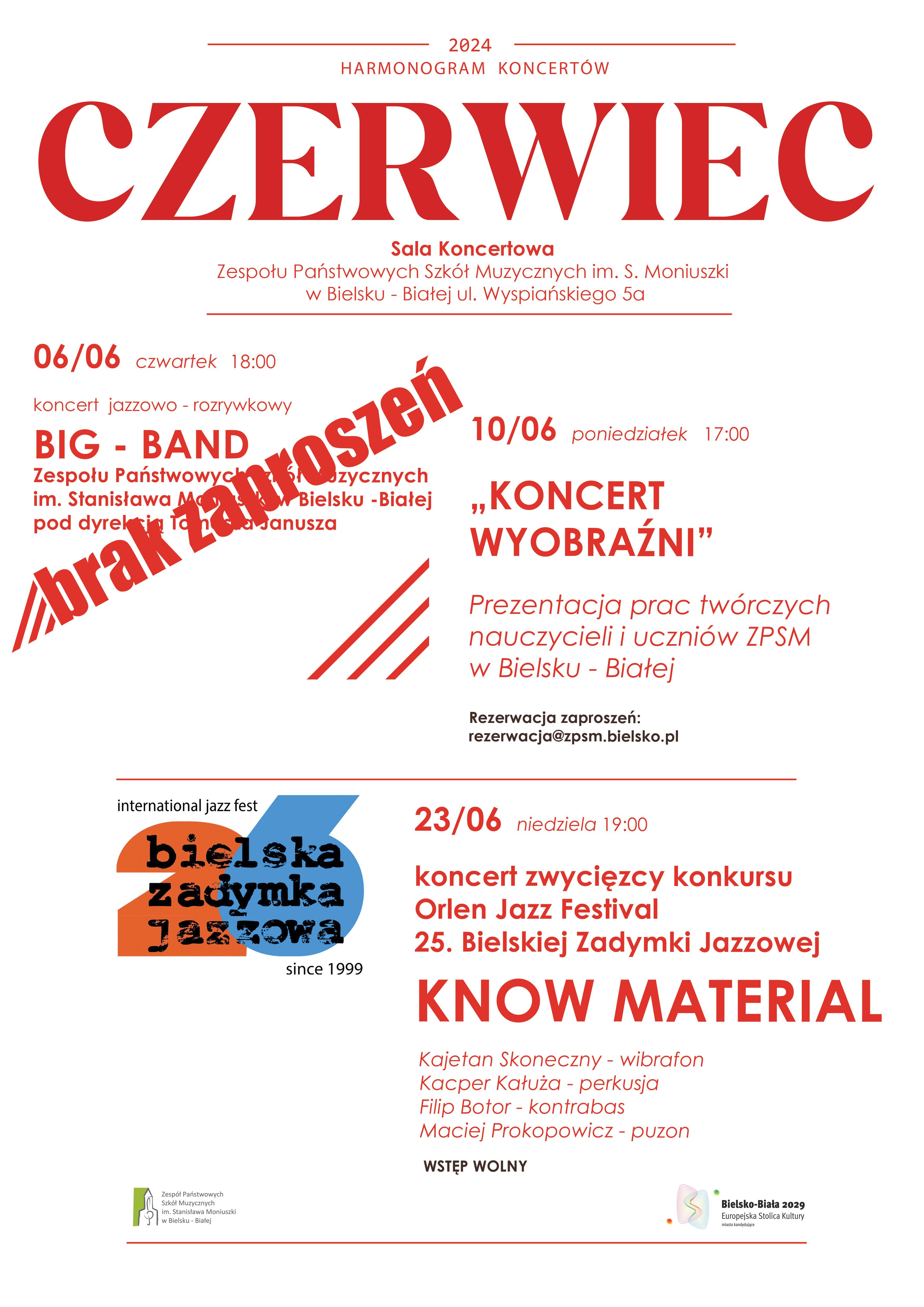 plakat koncertów z sali koncertowej ZPSM na czerwiec 2024. białe tło, czerwone napisy