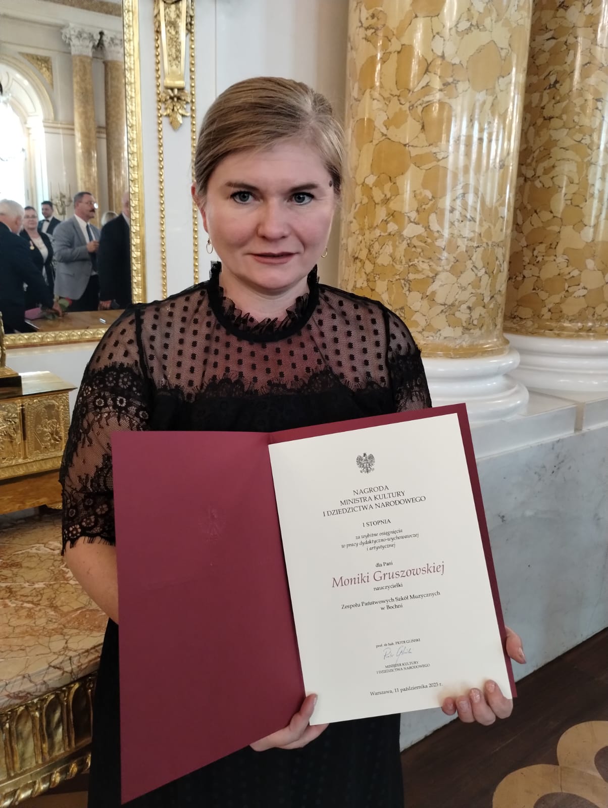 11 października 2023 r. w Zamku Królewskim w Warszawie Pani dr Monika Gruszowska, nauczycielka śpiewu i chóru w naszej szkole odebrała nagrodę I stopnia Ministra Kultury i Dziedzictwa Narodowego za wybitne osiągnięcia w pracy dydaktyczno-wychowawczej i artystycznej.