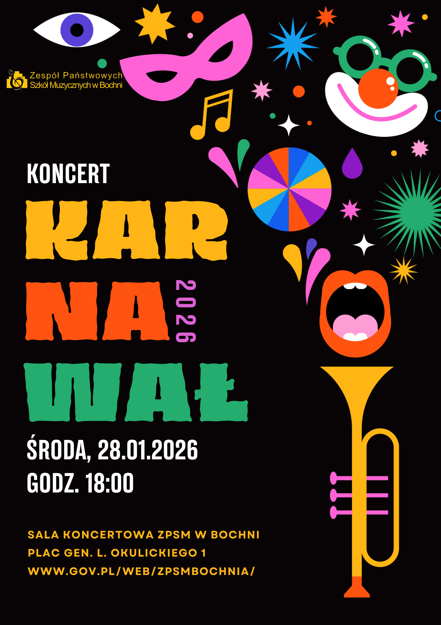 W środę 28 stycznia 2026 roku w sali koncertowej odbędzie się KONCERT KARNAWAŁOWY w wykonaniu uczniów ZPSM w Bochni. Początek wydarzenia o godz. 18:00.
