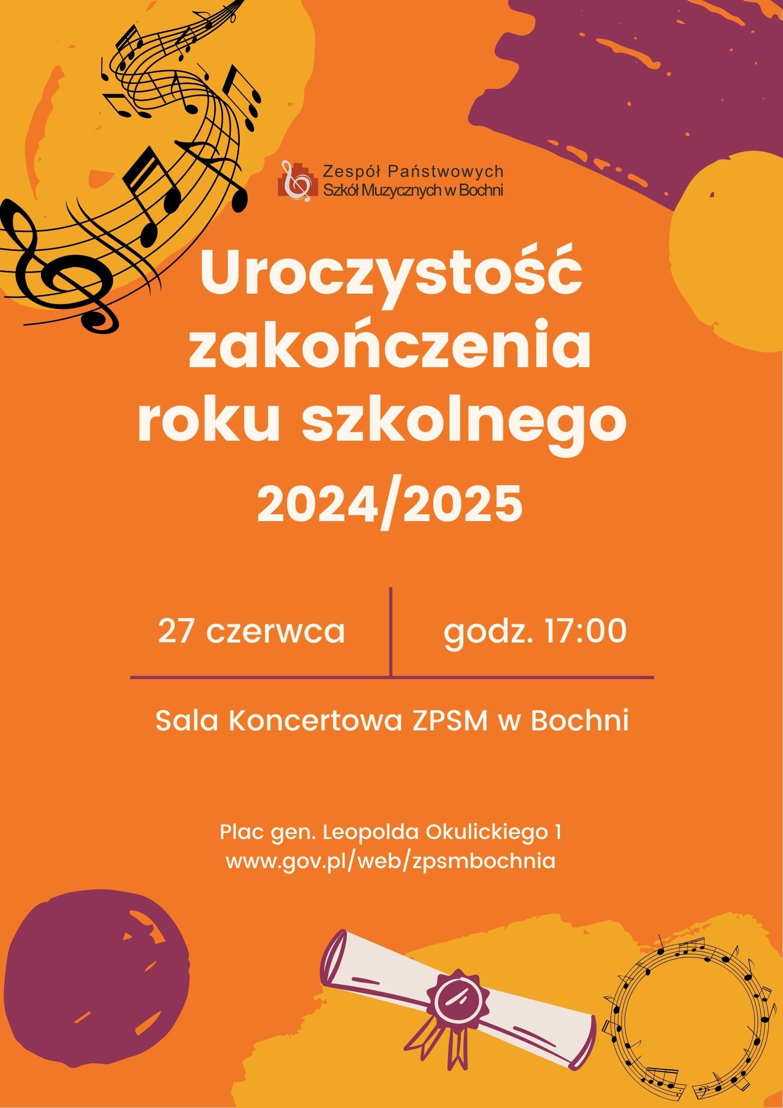 Na wielobarwnym tle z elementami pięciolinii oraz nut na górze znajduje się logo szkoły. W części centralnej widnieje napis: ,,Uroczystość zakończenia roku szkolnego 2024/2025, 27 czerwca, godz. 17:00, Sala Koncertowa ZPSM w Bochni”. Poniżej zamieszczony jest adres placówki oraz adres internetowy szkoły.