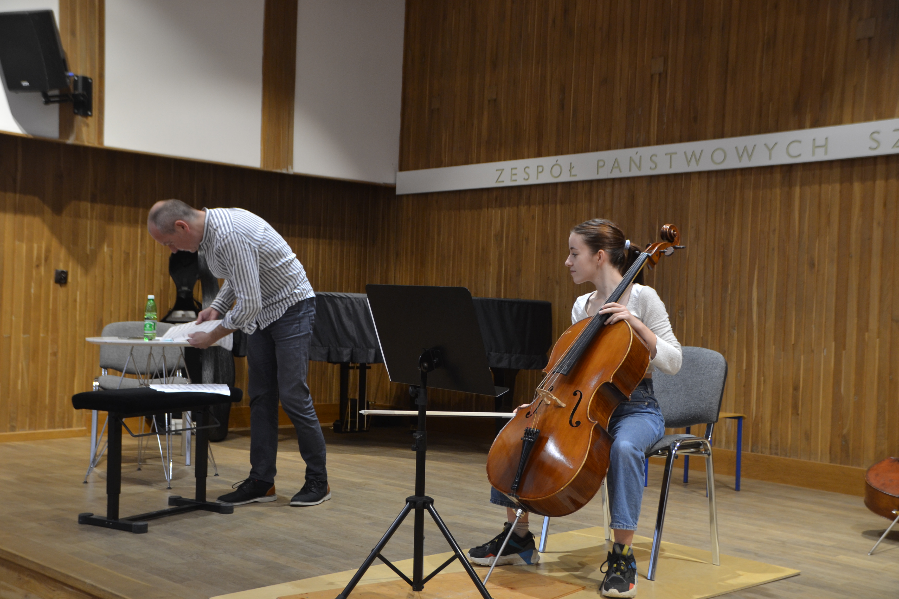 W dniach 23 i 24 października 2023 r. odbyły się w naszej szkole warsztaty dla nauczycieli wiolonczeli szkół muzycznych Regionu X – małopolskiego i świętokrzyskiego. Prowadzącym warsztaty był prof. Rafał Kwiatkowski wykładowca Uniwersytetu Muzycznego Fryderyka Chopina w Warszawie.