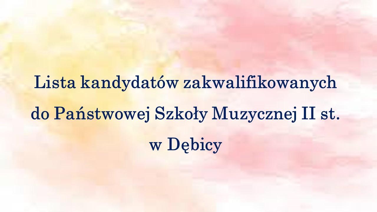 Lista kandydatów zakwalifikowanych z egzaminu wstępnego do PSM II st. w Dębicy na rok szkolny 2024/2025, została podana do publicznej wiadomości poprzez wywieszenie w dniu 20 maja 2024r. na tablicy ogłoszeń, znajdującej się w holu Zespołu Państwowych Szkół Muzycznych im. prof. Krzysztofa Pendereckiego w Dębicy przy ul. Kościuszki 8.