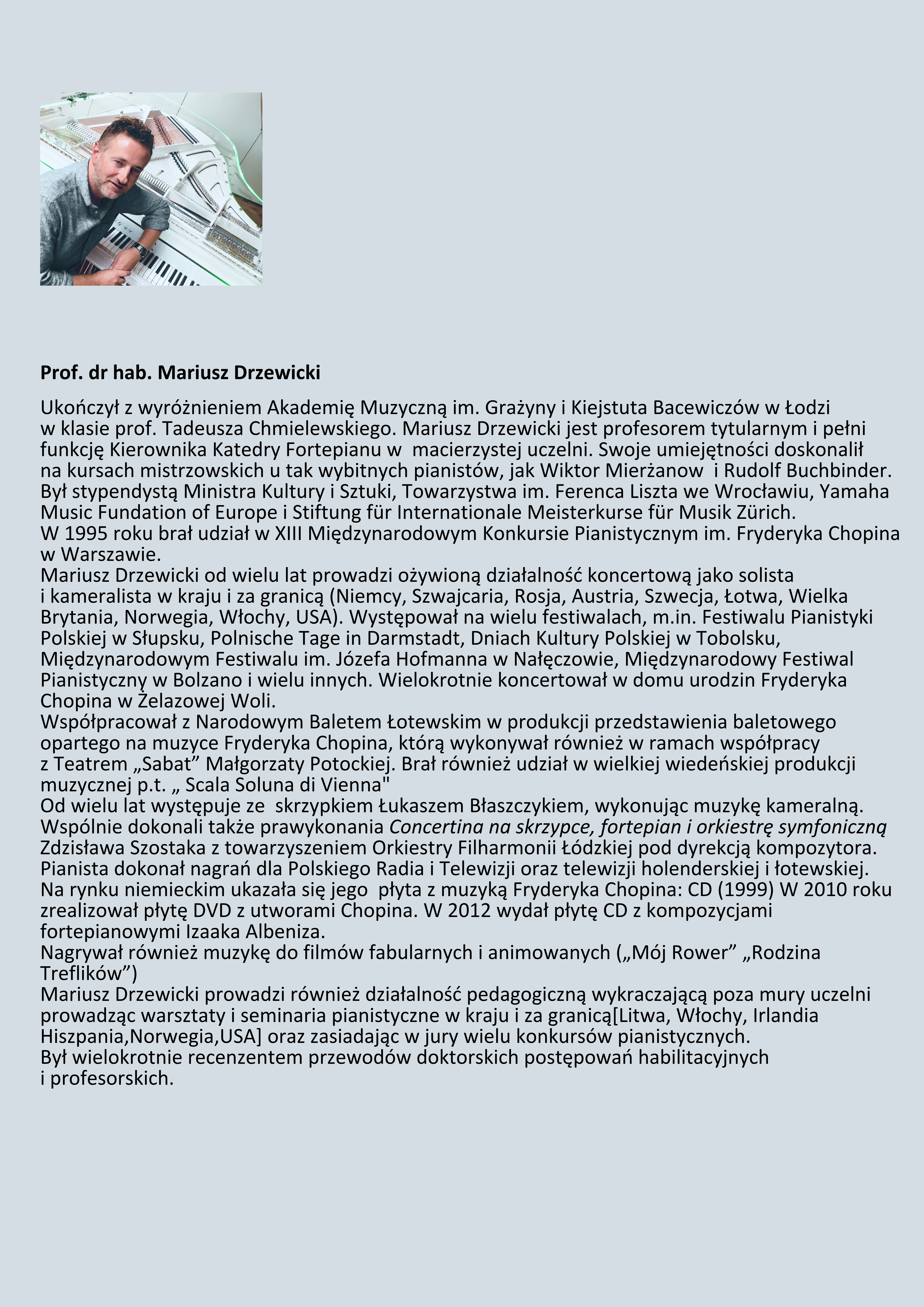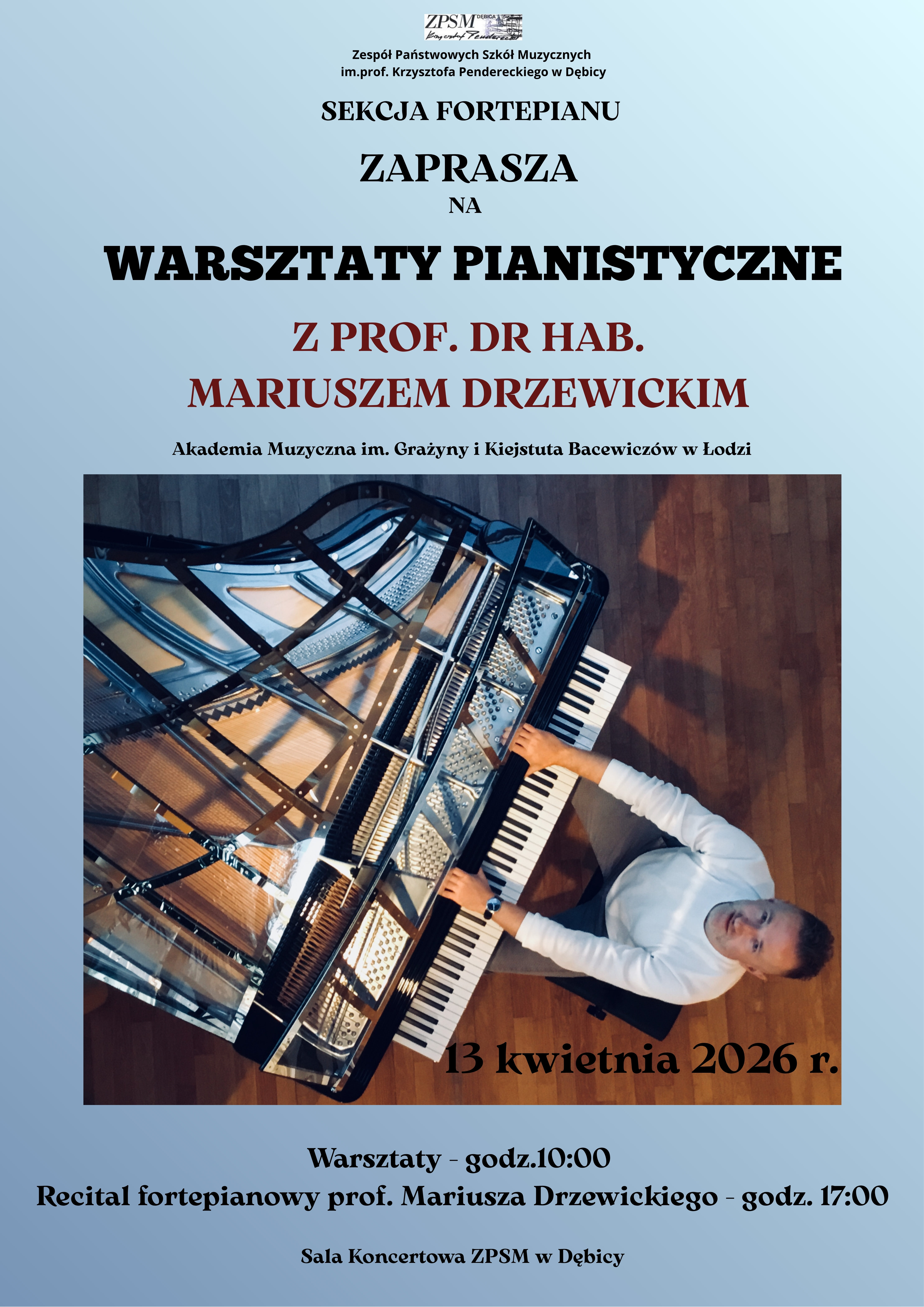 13 kwietnia 2026 r. (poniedziałek) o godz. 10:00, które poprowadzi prof. dr hab. Mariusz Drzewicki z Akademii Muzycznej w Łodzi. Będzie to doskonała okazja do rozwijania umiejętności oraz pogłębiania wiedzy w zakresie gry na fortepianie. Po zajęciach, o godz. 17:00, odbędzie się koncert w wykonaniu prof. Mariusza Drzewickiego.