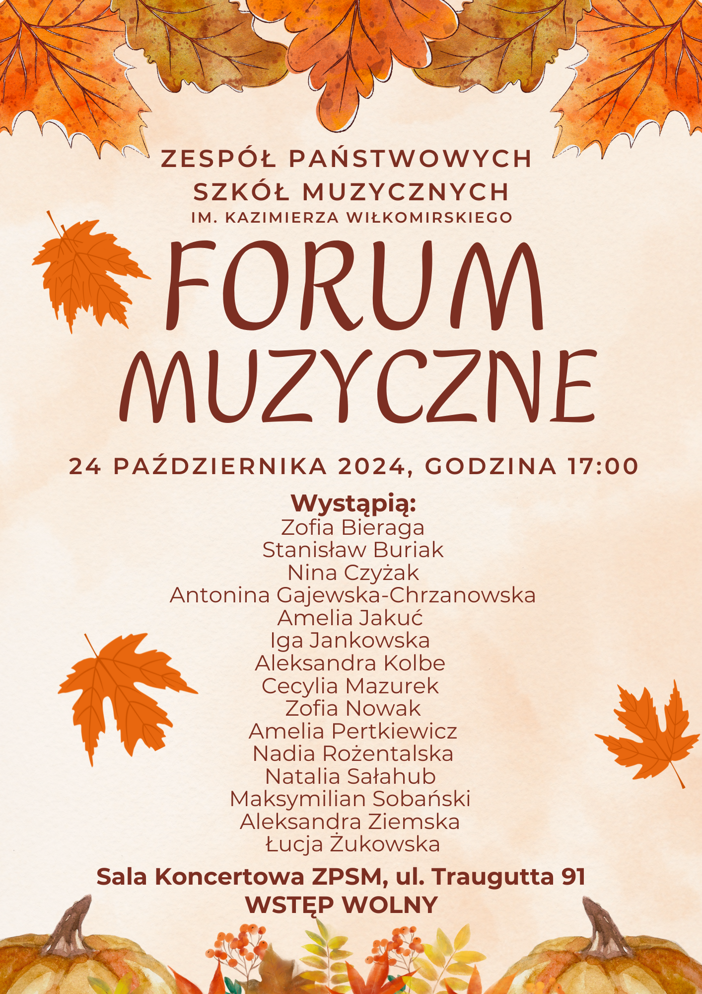 Plakat w tonacji jesiennej z napisem Zespół Państwowych Szkół Muzycznych w Elblągu, Forum Muzyczne; 24 października 2024 godzina 17:00; Sala koncertowa ZPSM , ul . Traugutta 91, wstęp wolny