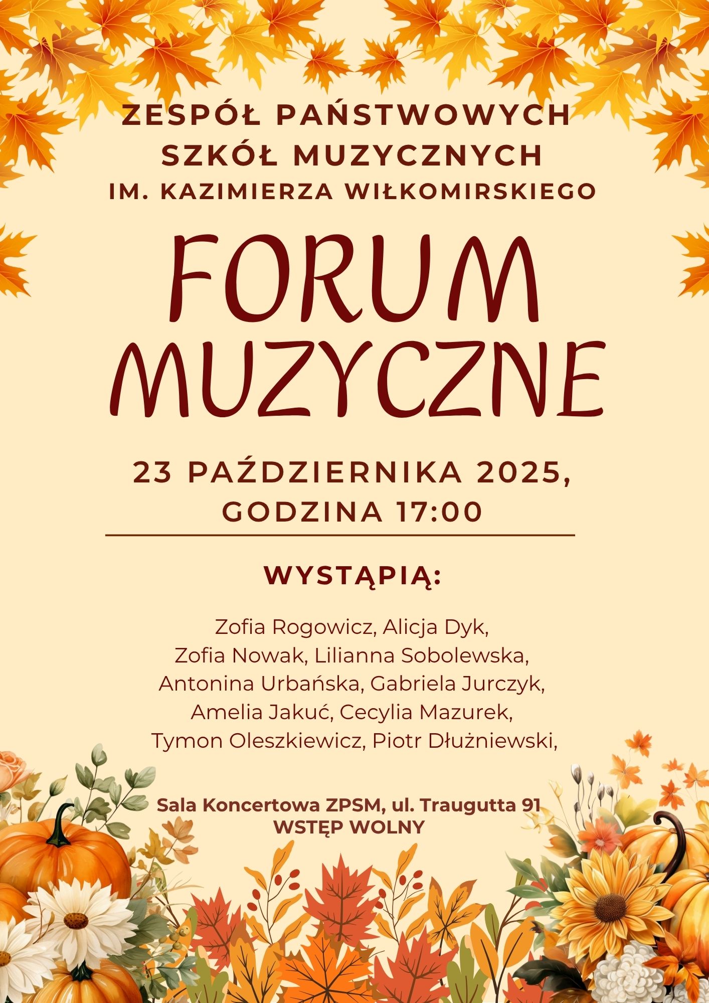 banner w tonacji jesiennej z napisem Zespół Państwowych Szkół Muzycznych w Elblągu, Forum Muzyczne, 23 października 2025 godzina 17:00, sala koncertowa ZPSM