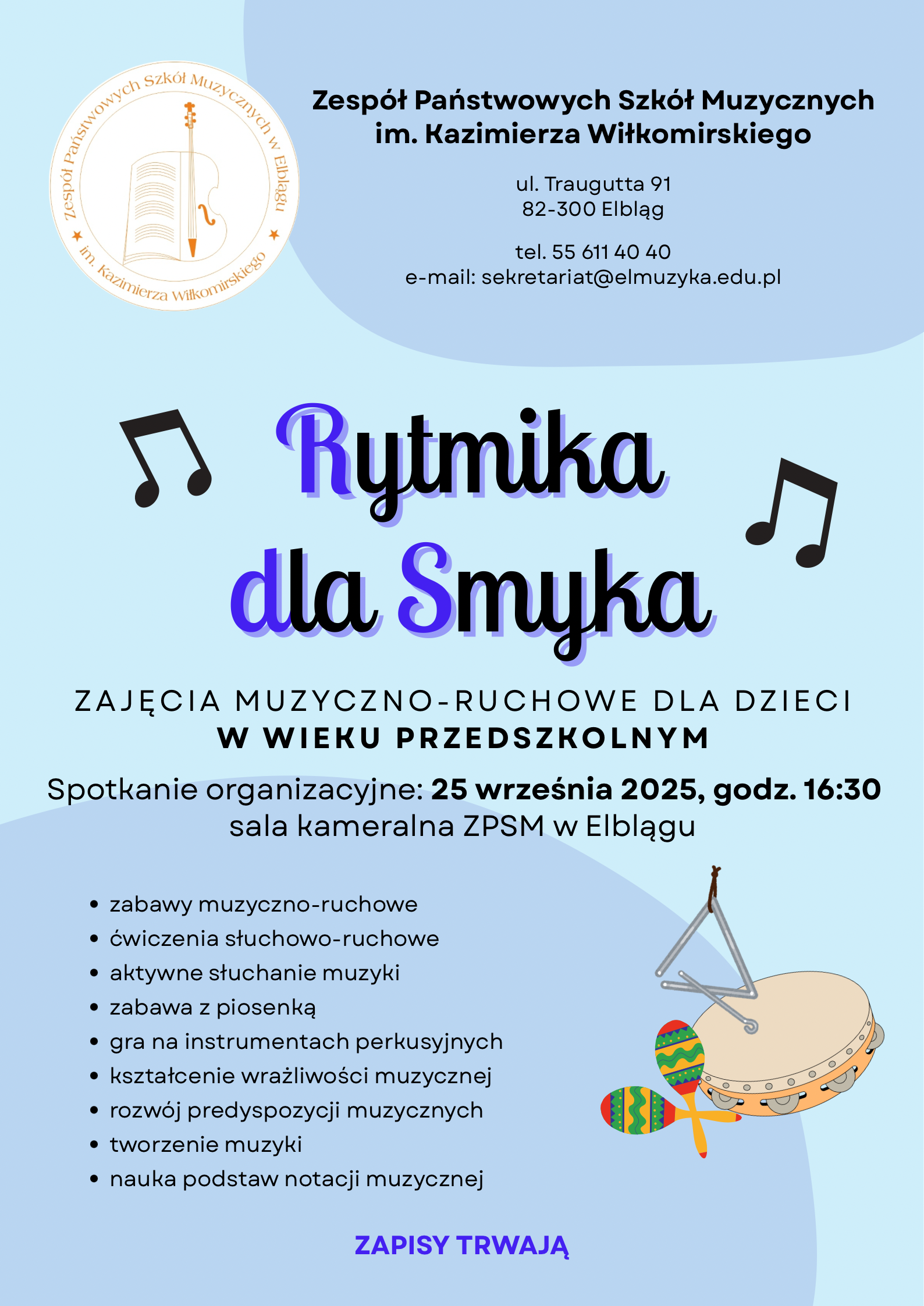 plakat z napisem Zespół Państwowych Szkół Muzycznych im. Kazimierza Wiłkomirskiego, w centralnej części napis Rytmika dla Smyka, zajęcia muzyczno-ruchowe dla dzieci w wieku przedszkolnym. spotkanie organizacyjne 25 września 2025 godzina 16:30