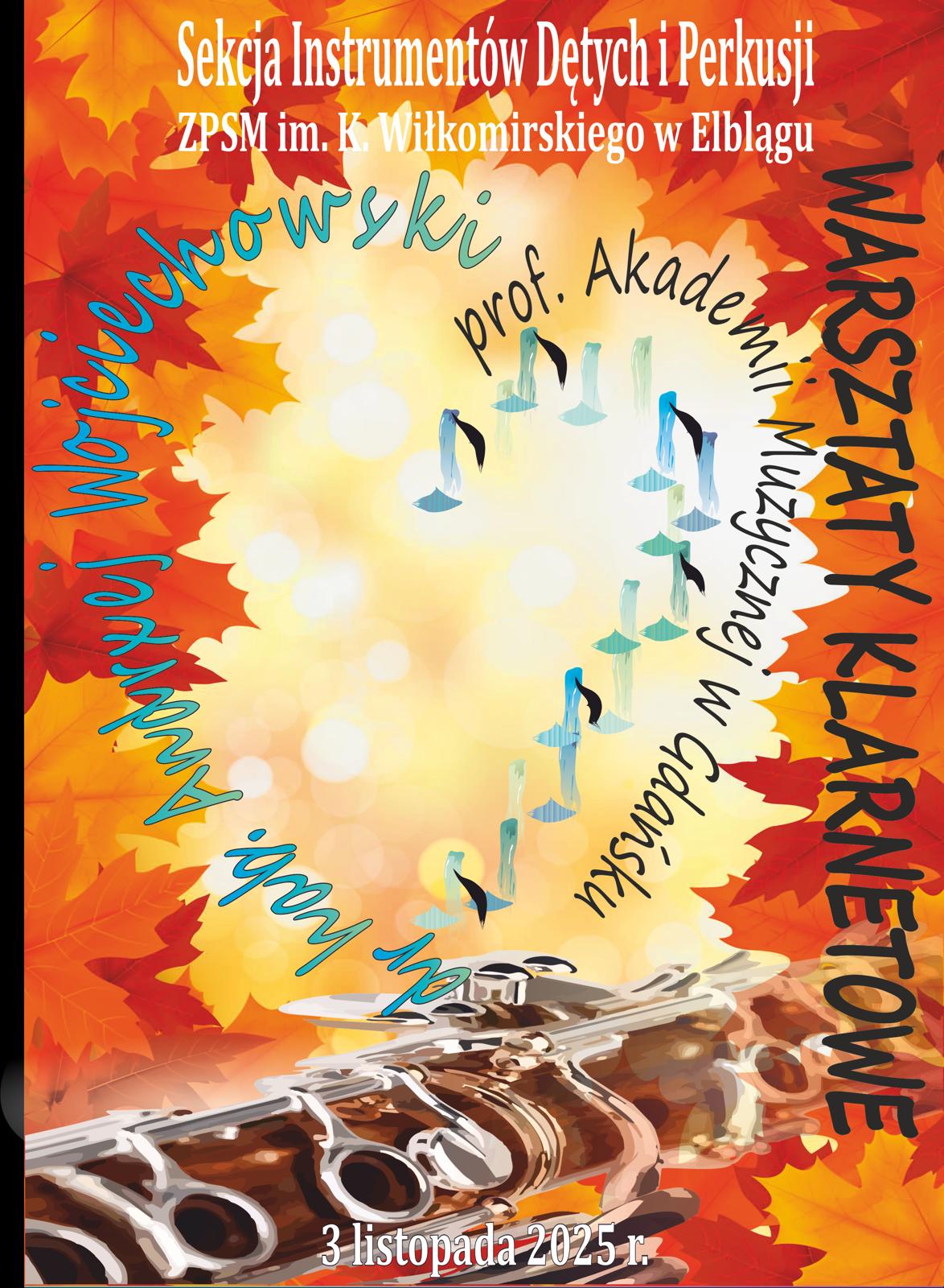 plakat z tonacji jesiennej z napisem sekcja instrumentów dętych i perkusji, ZPSM im.Kazimierza Wiłkomirskiego, Warsztaty KLarnetowe