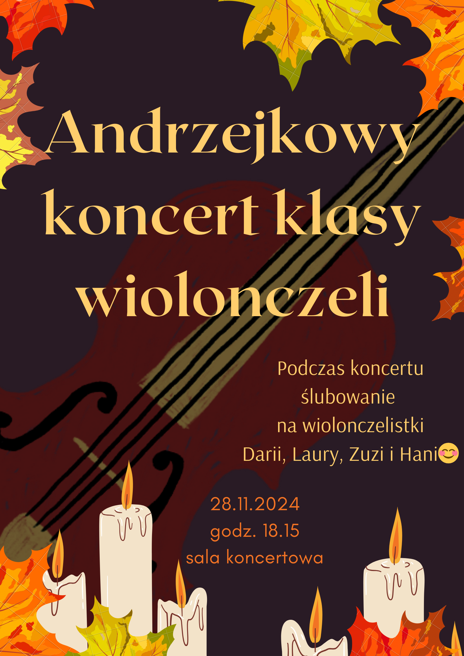 28 listopada o godz. 18.15 zapraszamy serdecznie na andrzejkowy koncert wiolonczelistów z klasy Moniki Łukawskiej.