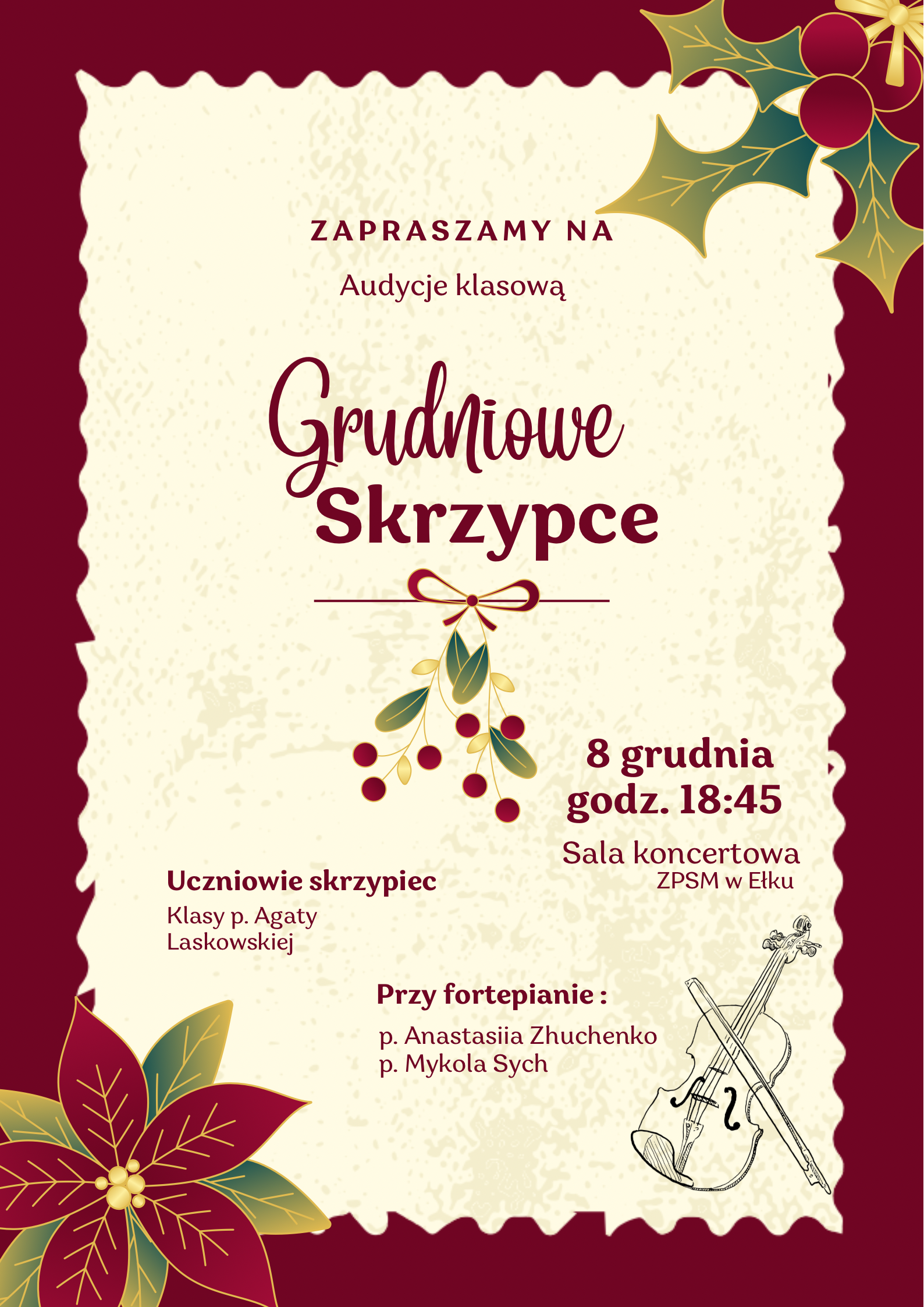 Zapraszamy na grudniową audycję klasy skrzypiec Agaty Laskowskiej. Odbędzie się ona 8 grudnia 2025 roku o godz. 18:45 w sali koncertowej ZPSM w Ełku.