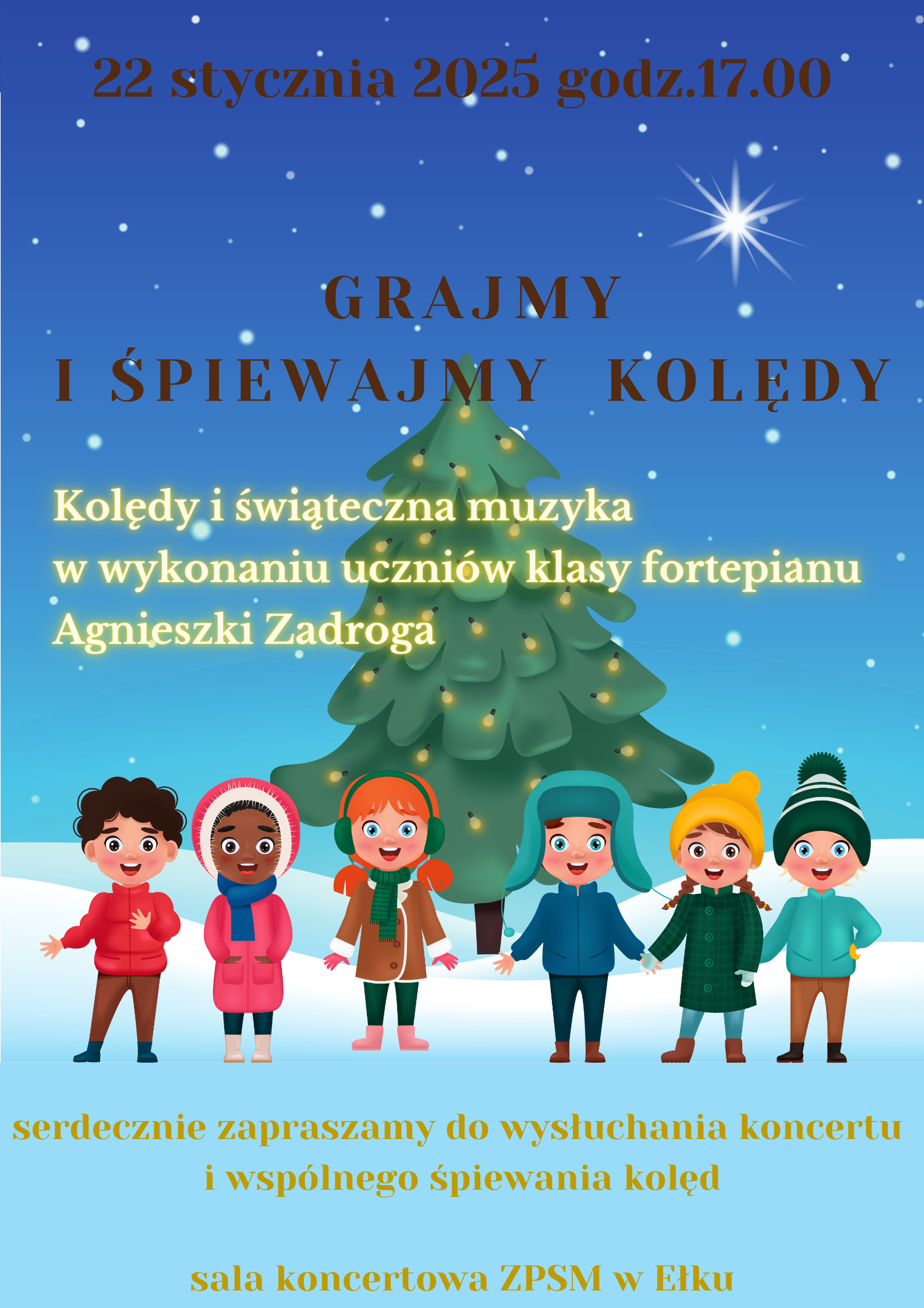 Serdecznie zapraszamy 22 stycznia o godz. 17.00 na koncert uczniów klasy fortepianu Agnieszki Zadroga. Młodzi wykonawcy zagrają kolędy i zagraniczną muzykę świąteczną solo oraz na cztery ręce. Będzie to nie tylko czas na słuchanie ale również śpiewanie kolęd.