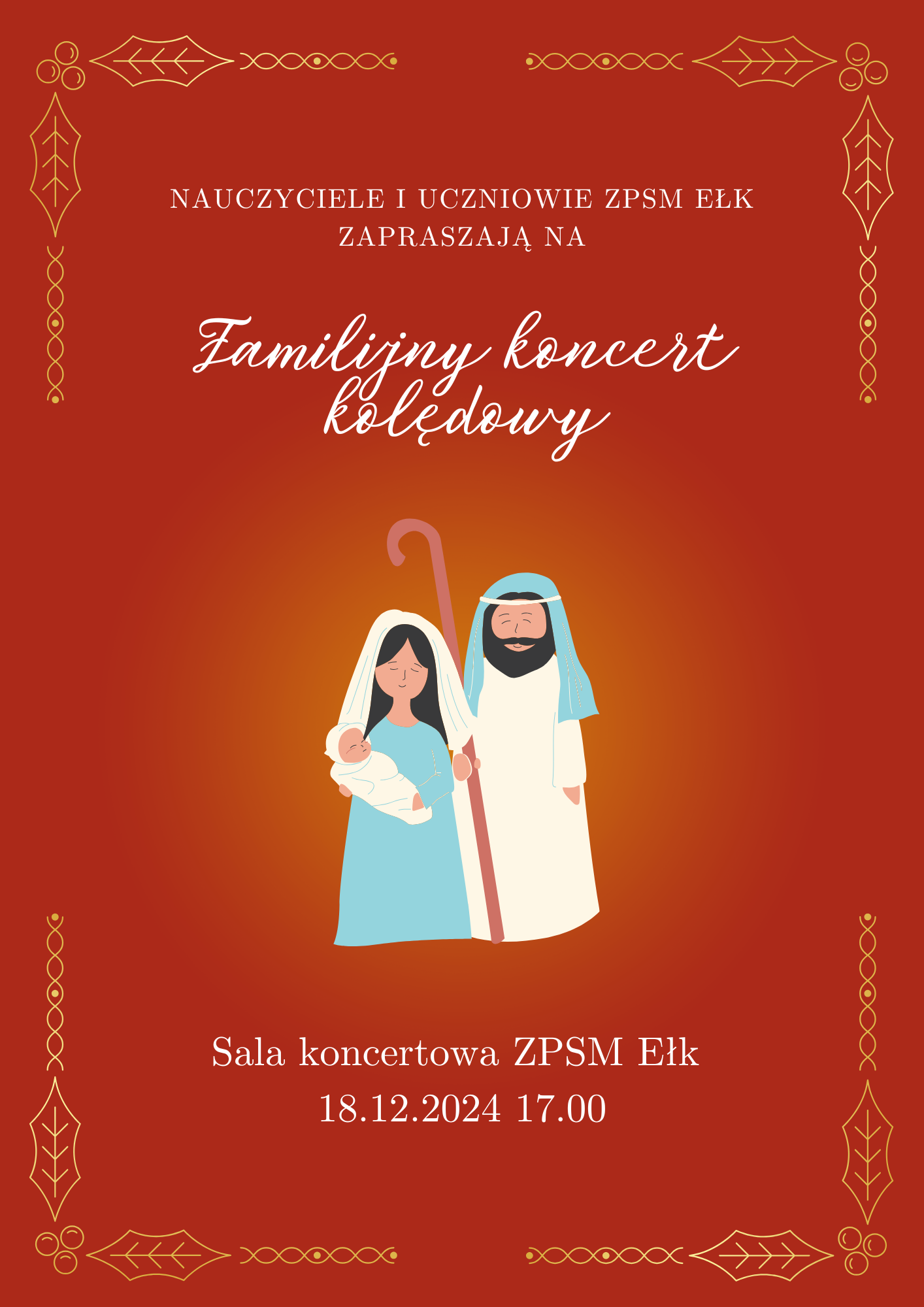 Społeczność Zespołu Państwowych Szkół Muzycznych I i II stopnia w Ełku zaprasza serdecznie na świąteczny koncert familijny, który odbędzie się we środę 18.12 o godzinie 17.00 w sali koncertowej ZPSM . To już kolejny międzypokoleniowy koncert, na którym występują całe rodziny wspólnie śpiewając polskie kolędy i inne piosenki związane ze Świętami Bożego Narodzenia! Serdecznie zapraszamy wszystkich rodziców, dziadków, wujków, ciocie, rodzeństwo i wszystkich przyjaciół na ten niesamowity wieczór!