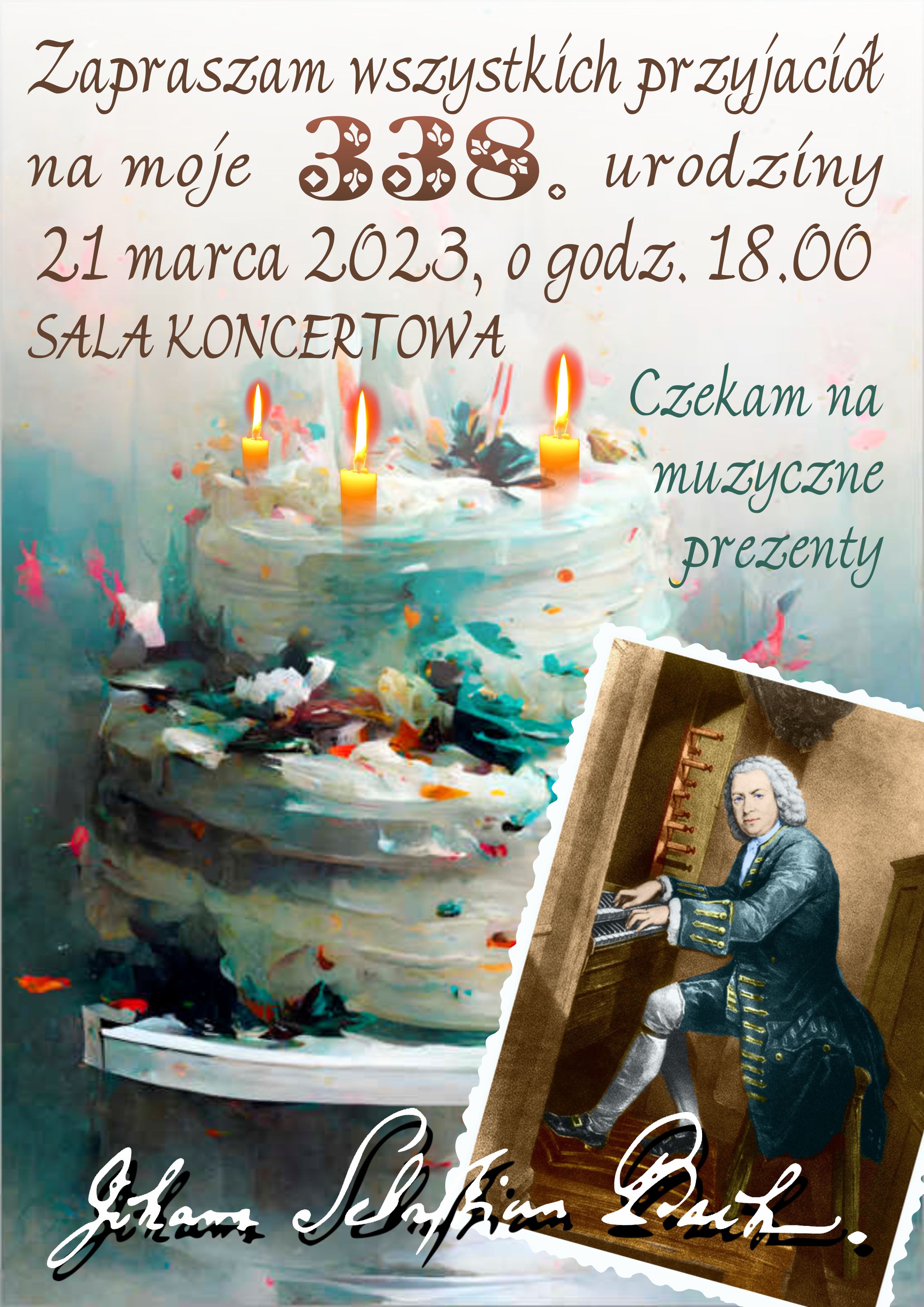 Zapraszam wszystkich przyjaciół na moje 338. urodziny - 21 marca 2023 o godz. 18.00 w sali koncertowej szkoły. Jan Sebastian Bach