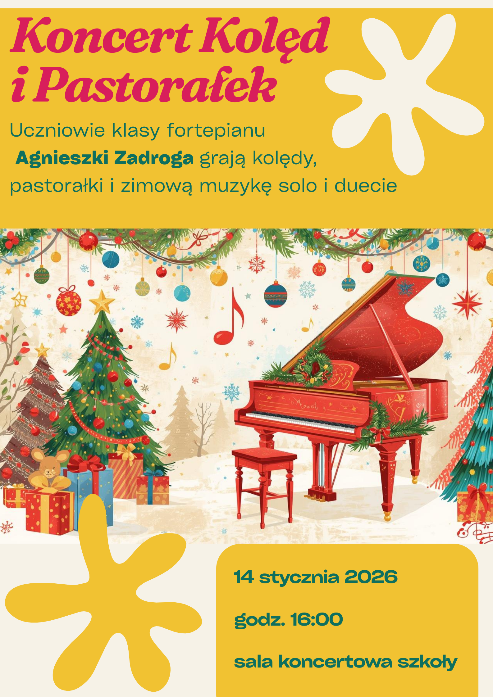 Zapraszamy na koncert kolęd, pastorałek i muzyki zimowej w wykonaniu uczniów klasy fortepianu Agnieszki Zadroga.
