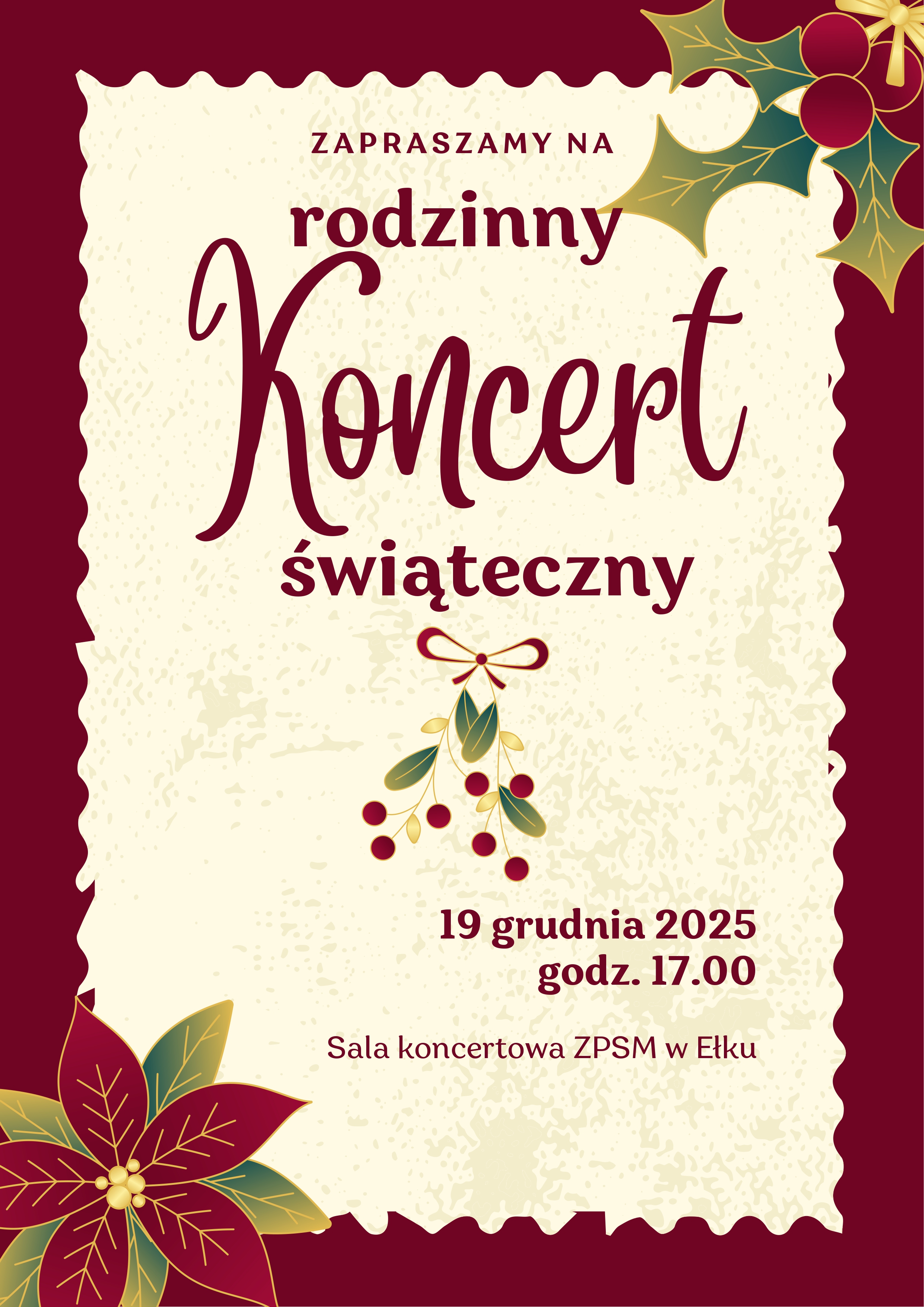 Zapraszamy serdecznie na Świąteczny Koncert Rodzinny, który odbędzie się 19 grudnia 2025 roku o godz. 17.00 w Sali Koncertowej.