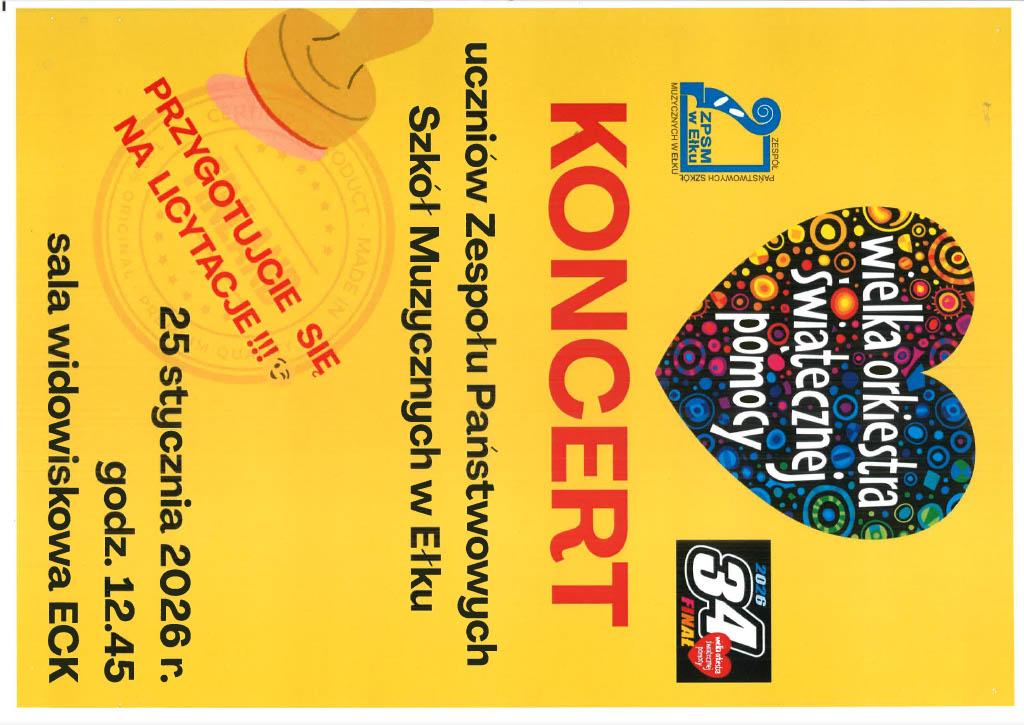 Zapraszamy na koncert uczniów Zespołu Państwowych Szkół Muzycznych w Ełku w ramach Wielkiej Orkiestry Świątecznej Pomocy. Koncert odbędzie się o godz. 12.45 w sali widowiskowej Ełckiego Centrum Kulltury w niedzielę, 25 stycznia 2026 roku.