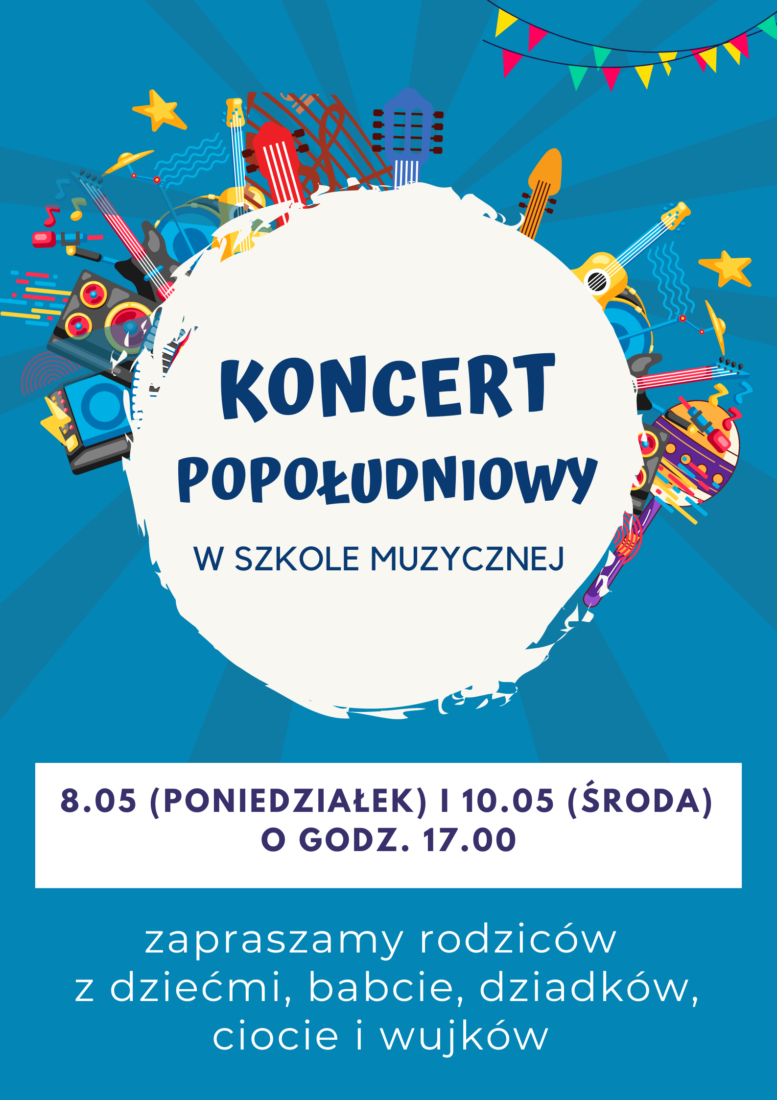 Serdecznie zapraszamy wszystkich rodziców z dziećmi oraz osoby zainteresowane nauką gry na instrumentach na nasz koncert popołudniowy w ramach Dni Otwartych 8 i 10 maja 2023 r. o godzinie 17:00 w sali koncertowej. Wstęp jest bezpłatny, a na miejscu będzie można poznać naszych nauczycieli oraz dowiedzieć się więcej o ofercie edukacyjnej. To będzie wspaniałe popołudnie pełne muzyki i inspiracji!