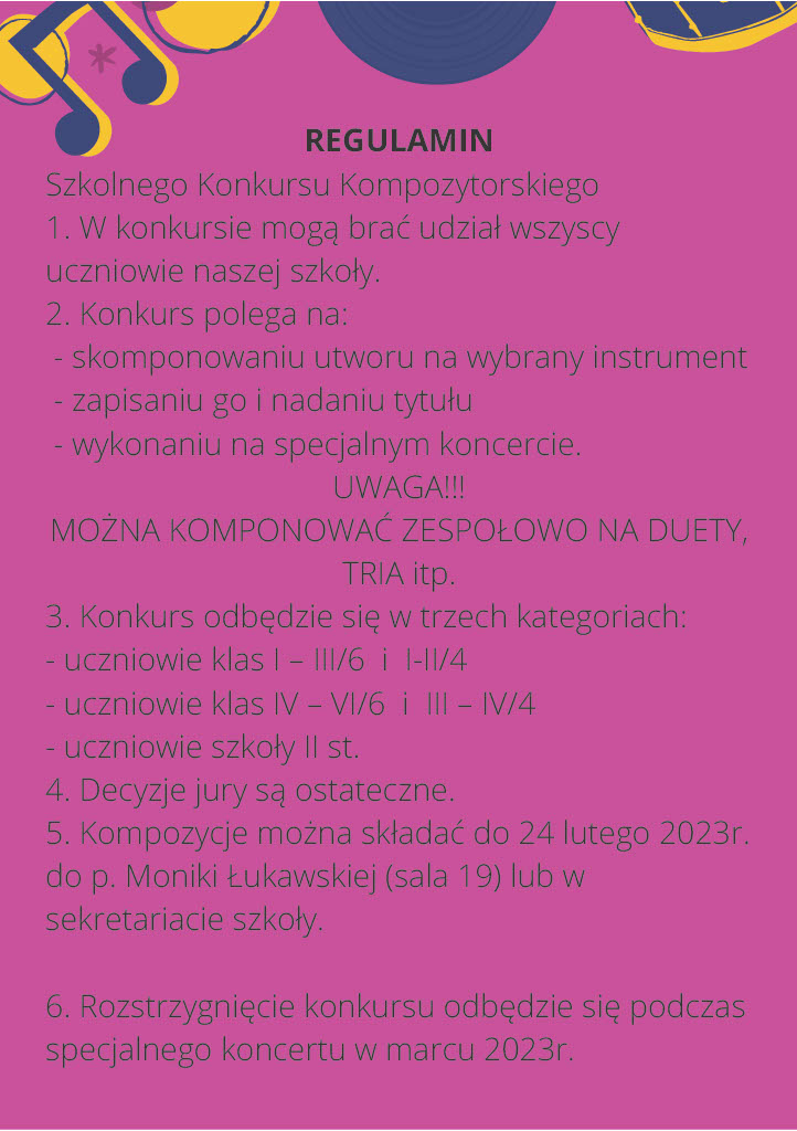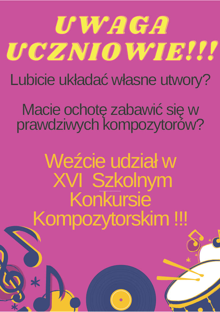 Zachęcamy do wzięcia udziału w szkolnym konkursie kompozytorskim. Szczegóły znajdują się w załączonym poniżej regulaminie konkursu.