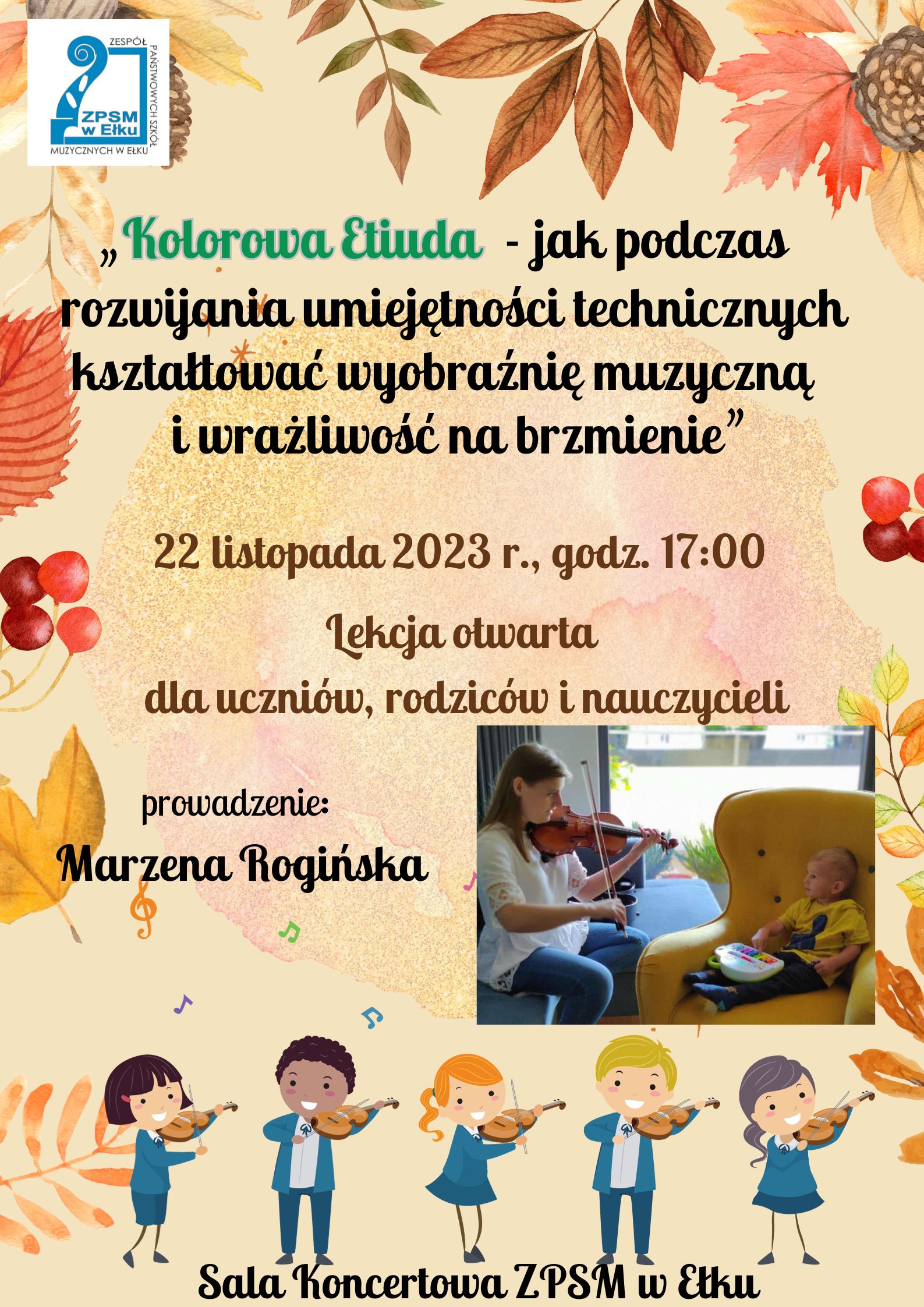Zapraszamy na lekcję otwartą dla uczniów, rodziców oraz nauczycieli prowadzoną przez panią Marzenę Rogińską 22 listopada 2023 r. o godz. 17.00. Temat przewodni to wyobraźnia muzyczna i wrażliwość na brzemienie.