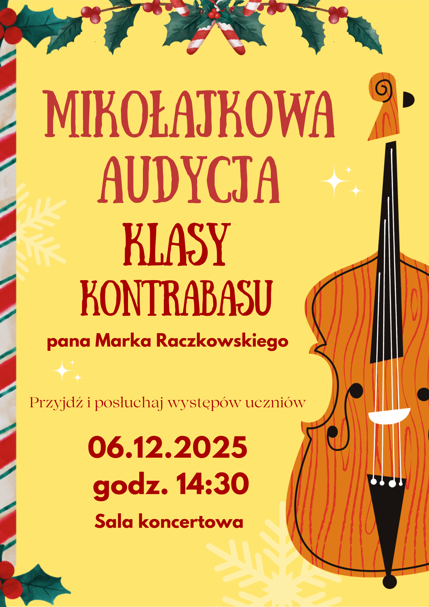 Zapraszamy na mikołajkową audycję klasy kontrabasu, która odbędzie się 6 grudnia o godz. 14:30 w sali koncertowej szkoły. Akompaniuje Ewa Chomicz-Wysocka oraz Marek Raczkowski.
