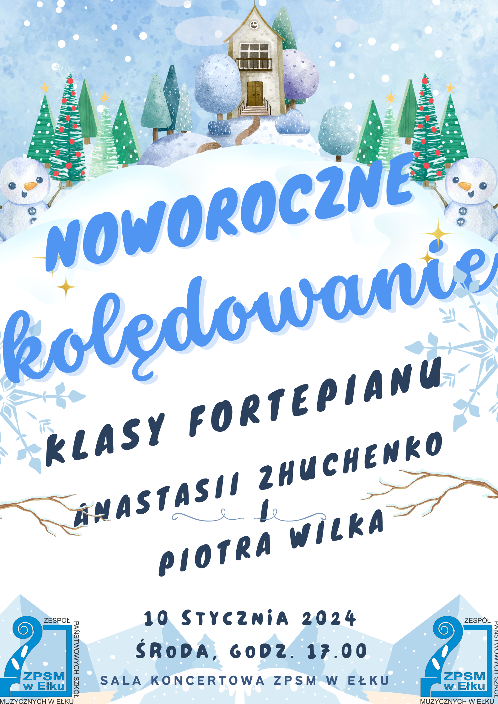Uczniowie klasy fortepianu Anastasii Zhuchenko oraz Piotra Wilka zapraszają na koncert. W programie usłyszymy najpiękniejsze polskie kolędy jak również utwory kompozytorów muzyki fortepianowej. Jak zwykle nie zabranie niespodzianek i dobrej atmosfery.