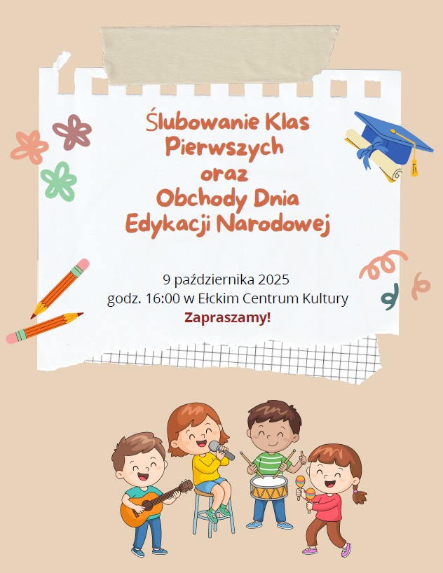 Zapraszamy w czwartek 9.10.2025 o godz. 16.00 do Ełckiego Centrum Kultury na obchody Dnia Edukacji Narodowej. Uczniowie klas pierwszych złożą wtedy uroczyste ślubowanie. Nie zabraknie muzyki i ... niespodzianki przygotowanej przez Samorząd Uczniowski.