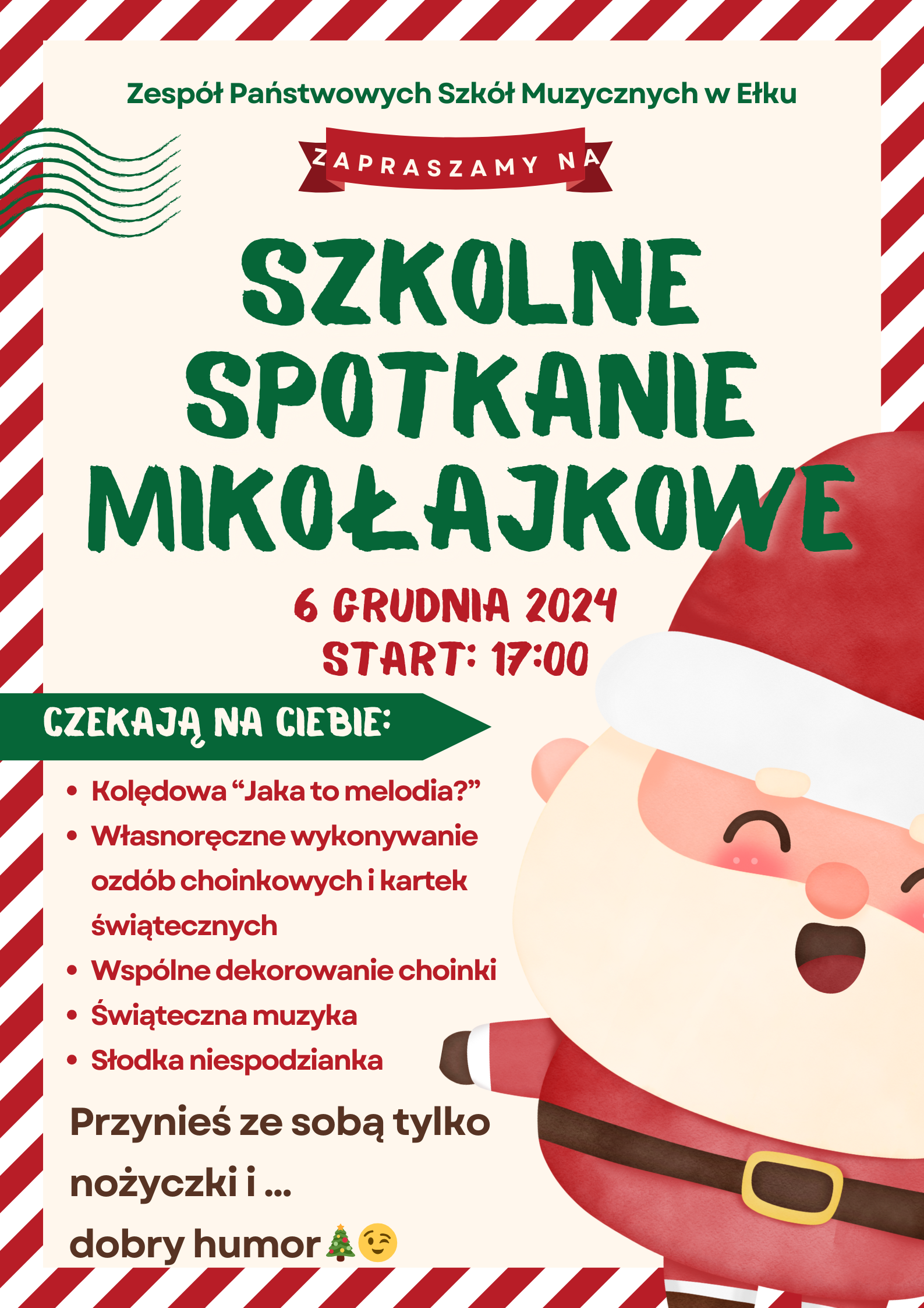Szkolne Spotkanie Mikołajkowe 6 grudnia 03.12.2024 Serdecznie zapraszamy na Szkolne Spotkanie Mikołajkowe - 6 grudnia o godz. 17.00. Szczegóły na plakacie. Zdjęcia (1) Pokaż zdjęcie 1 z galerii.