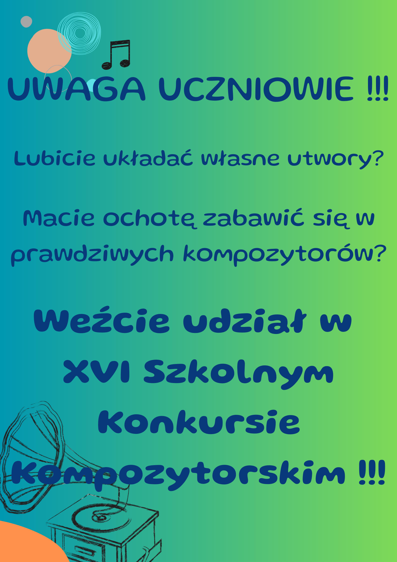 Zapraszamy wszystkich chętnych uczniów naszej szkoły do wzięcia udziału w Szkolnym Konkursie Kompozytorskim. Jest to cudowna okazja do wypróbowania swoich sił i umiejętności w pisaniu utworów muzycznych na swój instrument ale nie tylko. Można komponować utwór na każdy instrument a nawet zespoły instrumentalne. Na pewno rozmowa z nauczycielem przedmiotów teoretycznych bądź instrumentu głównego pomoże w obraniu właściwej drogi i podpowie jak do tego się zabrać.