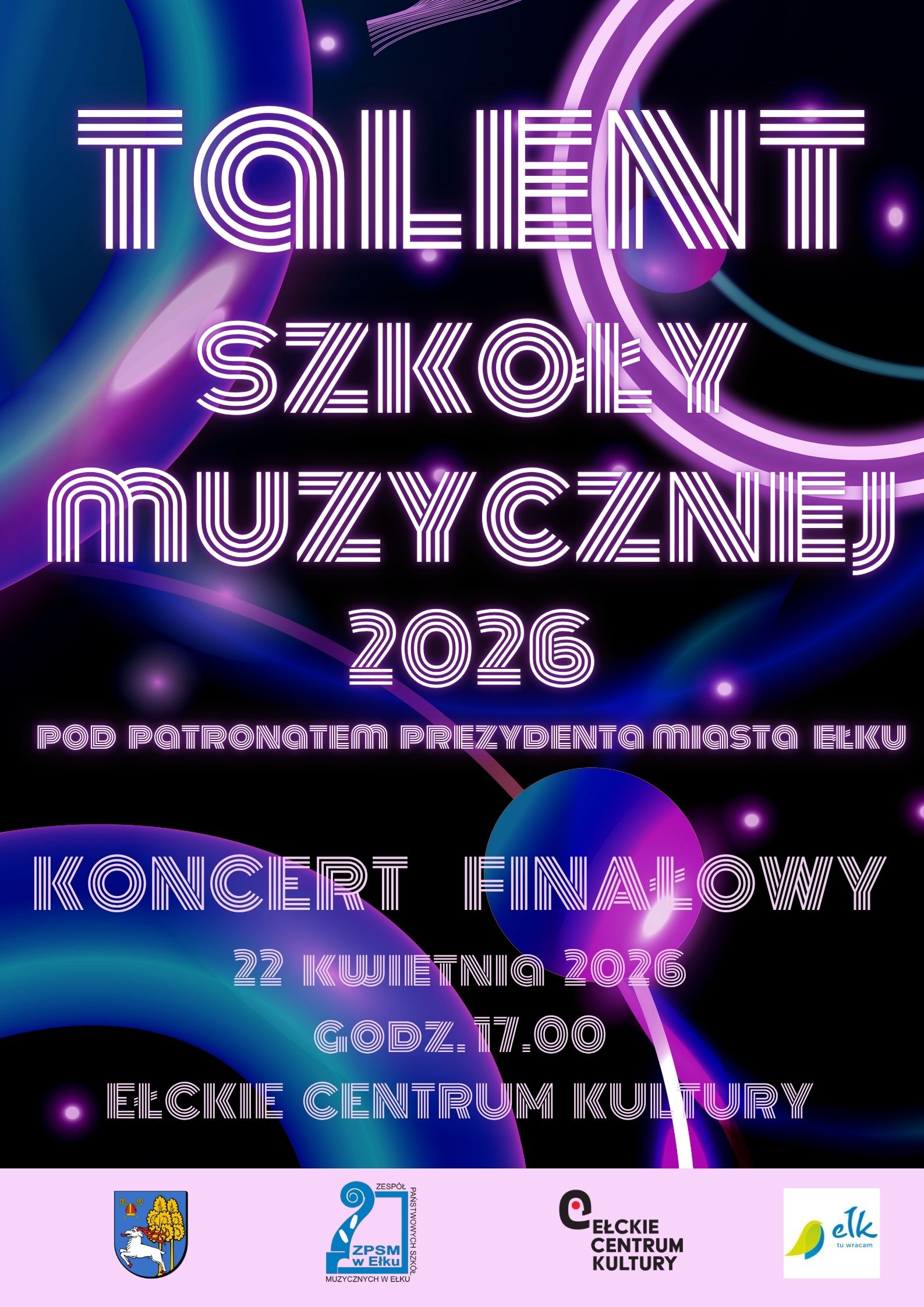 W środę 22 kwietnia 2026 r. o godz. 17.00 w Ełckie Centrum Kultury odbędzie się finał konkursu Talent Szkoły Muzycznej 2026 pod patronatem Prezydenta Miasta Ełku. O wyborze zwycięzców zdecyduje publiczność. Oprócz wykonań muzycznych zobaczycie filmy, które przygotowali o sobie uczestnicy konkursu. Zabierzcie ze sobą telefony z dostępem do Internetu, aby móc zagłosować na swojego faworyta.