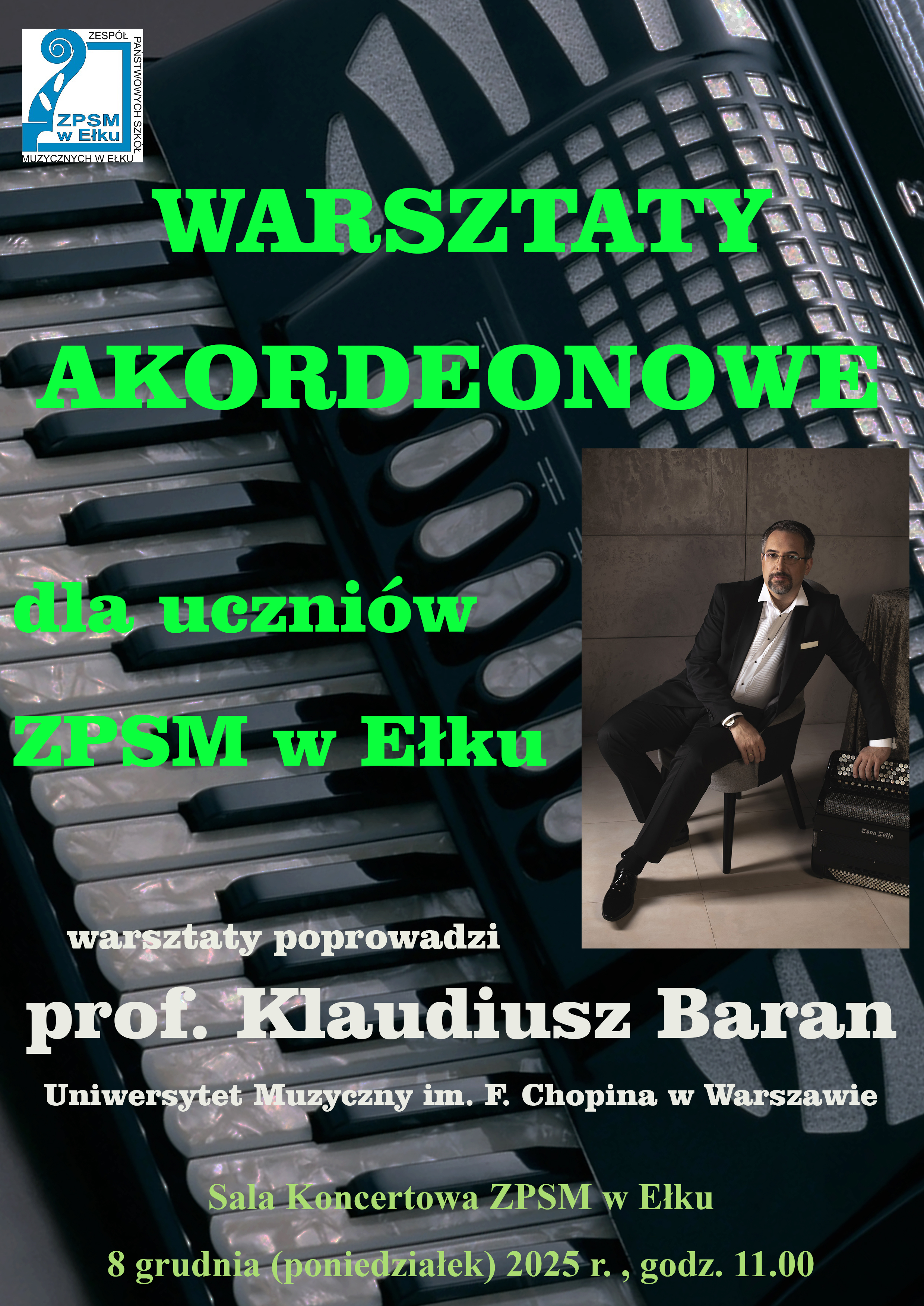 Warsztaty z prof. Klaudiuszem Baranem dla akordeonistów odbędą się 8 grudnia od godz. 11.00. Zapraszamy.