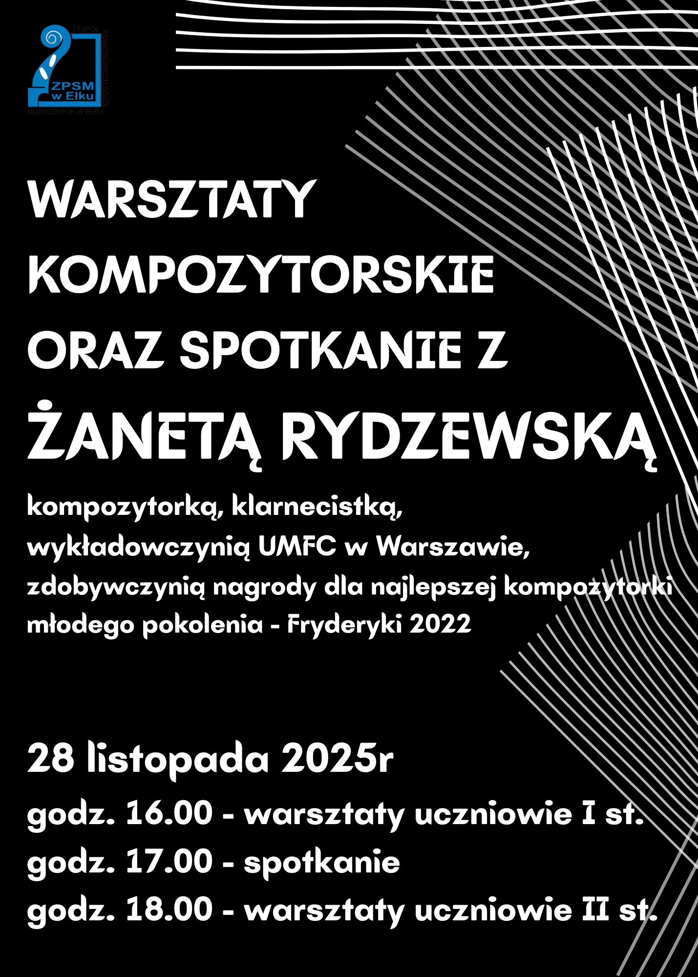 Serdecznie zapraszamy na spotkanie oraz warsztaty kompozytorskie z Żanetą Rydzewską - absolwentką naszej szkoły, wykładowczynią UMFC w Warszawie, zdobywczynią Fryderyka 2022.